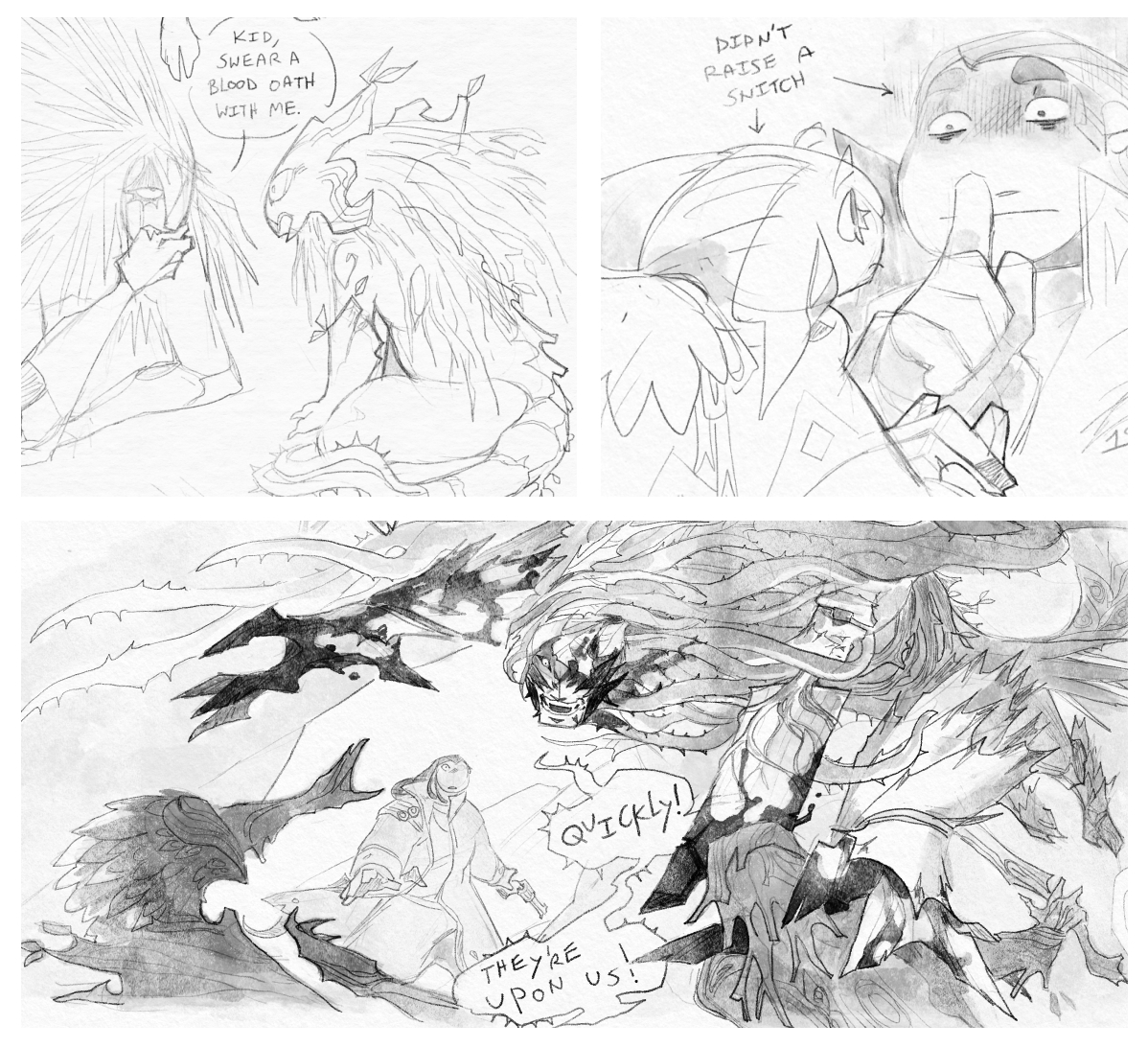 First of the first and last of the last have grief that rhymes, but instead of bringing them together, it just gives them 3947287 layers of beef that they’re too stoic to act out about. (And _then_ it brings them together. Later. Much later.)> [**Image:** A short comic in stylized, quadriptych-like geometry. The first panel shows the Lastborn gesticulating as he looks down into his own silhouette, which encloses Trahearne. He says ‘You were one of the first to leave… And you disappeared. You threw away the very thing that I could never have. I guess I resented you for that…’ > > The Lastborn turns away in the next panel, sheepishly folding his hands. Trahearne dips his head, deep in thought. The Lastborn continues. ‘I felt so betrayed that you left… And when you came back, I felt betrayed that it was so easy for you to come home… It meant I was alone in my alone-ness again.’ > > The next two panels invert the silhouettes of Trahearne and the Lastborn, with Trahearne rendered in white against a black background. He holds the sword Caladbolg / Caladcholg over his shoulders, but it seems to crumble under its own weight, and he does, too. He peeks out from the crook of his arm, and says ‘I never understood why you acted out. I envied you, actually. I thought you had been given the only true freedom.’ > > The Lastborn is minimized into a tiny sprite of himself. He sits at Trahearne’s feet and asks ‘Freedom?’ > > Trahearne continues. ‘Freedom from the Dream, the Hunt, the Tree, our people.’ > > In the last panel, more pieces of the blade fall away as Trahearne’s grip on it falters. He looks at the Lastborn properly, now, and says ‘Even when the weight of my burden became too great to carry alone, I couldn’t afford to fail. It was never an option. So I ran, and I hid myself in my studies. But I was never truly free.’] ◆◆◆ First of the first and last of the last have grief that rhymes, but instead of bringing them together, it just gives them 3947287 layers of beef that they’re too stoic to act out about. (And _then_ it brings them together. Later. Much later.)0 Comments 0 Shares 55 Views -