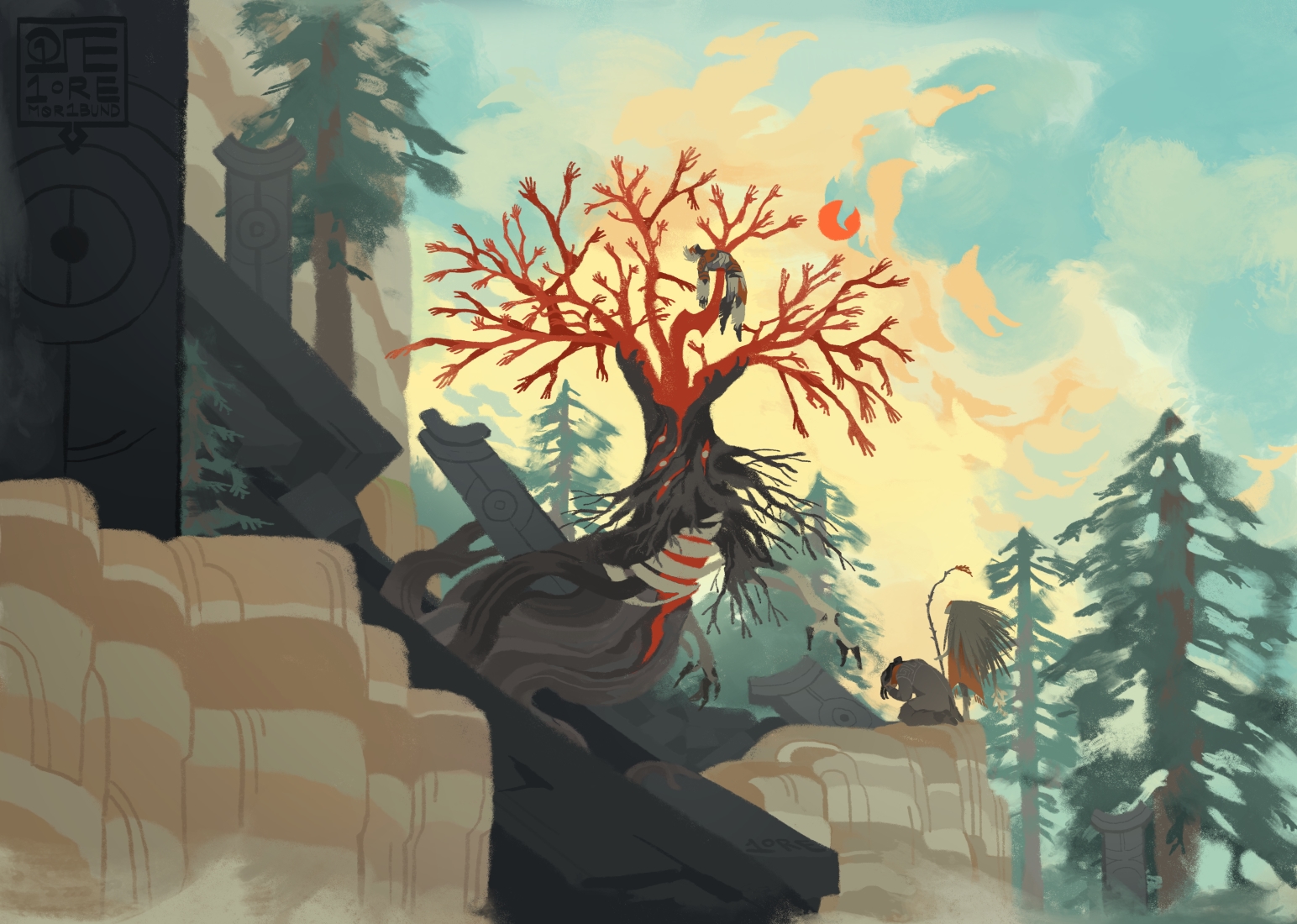 [**Image:** Tamahuaq fulfills its last wish to see the sun, at the cost of the Warden’s life. It breaks out of the prison-catacombs of Sond, its hunger outgrowing its body. Its innards blossom into a leafless tree of hyphae and viscera. The price is bitter; it no longer remembers how to photosynthesize. Meanwhile, the Warden’s body lies limp in the morning sun. He is speared on Tamahuaq’s boughs like the prey of a shrike. Yuri falls to his knees at the foot of the tree, despondent. Riven gazes up at the Warden’s body in silence.] ◆◆◆ > _"Th-this is a trick. It must be."_ > >_"Boy, **you** are a trick. A sad, clever trick…"_ One in a series of concept pieces for [Old Sond](https://m0r1bund.com/memories/godless-sond-and-the-ancestral-sarikote/), [the Arkoloteri](https://m0r1bund.com/memories/arkoloteri/), and [Tamahuaq’s company](https://m0r1bund.com/works/moribund/monomyth/) [of expies](https://m0r1bund.com/works/moribund/tamahuaqs/). **[Fallen Arkai](https://inkblot.art/post/cZPjv2OmYKZcpvv3hgw7) ◆ [Control Burn](https://inkblot.art/post/RJej6qPkH4s0RIKaegUB) ◆ [the Lung](https://inkblot.art/post/fe7XTlb9vpen6hAvPhIU) ◆ [Incandescence](https://inkblot.art/post/30Go6a2dQCtUur3HB9C6) ◆ [Foreign Body](https://inkblot.art/post/OHllWltOL71ahZSKw6Pv) ◆ First Light** 0 Comments 0 Shares 39 Views -