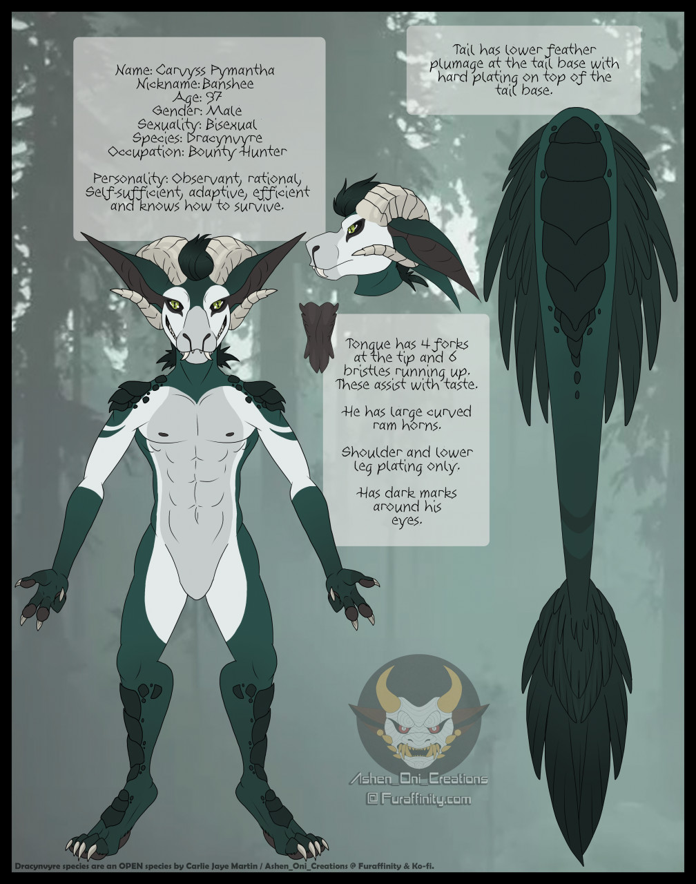 All art on this profile is © to me, Carlie Jaye Martin / Wasteland Oni / Ashen Oni Creations. DO NOT redistribute, steal/claim or mass produce my art or OC's at all. This means you may NOT use any of my art or characters in any way, shape or form, especially NOT without asking me first. If you see any of my character or art posted anywhere that isn't listed in my contact section or by me, then please contact me here about it. I also do not give permission for my art or OCs to be sold as NFTs, Crypto or any form of blockchain technology.Anyway meet Carvyss or Banshee as he likes to use as his bounty hunter name. He takes bounties to hunt the Lucid Children cultists that plague his home land. He grew up in Grimshade village in the swamps however due to his occupation he mostly travels now days staying at inns. His Toyhouse: https://toyhou.se/15714445.carvyss-pymantha-banshee- Dracynvyre species are OPEN soon. Get the base here F2U: https://ko-fi.com/s/6b563dceac My Linktree: https://linktr.ee/ashenonicreations All art on this profile is © to me, Carlie Jaye Martin / Wasteland Oni / Ashen Oni Creations. DO NOT redistribute, steal/claim or mass produce my art or OC's at all. This means you may NOT use any of my art or characters in any way, shape or form, especially NOT without asking me first. If you see any of my character or art posted anywhere that isn't listed in my contact section or by me, then please contact me here about it. I also do not give permission for my art or OCs to be sold as NFTs, Crypto or any form of blockchain technology.0 Comments 0 Shares 30 Views -