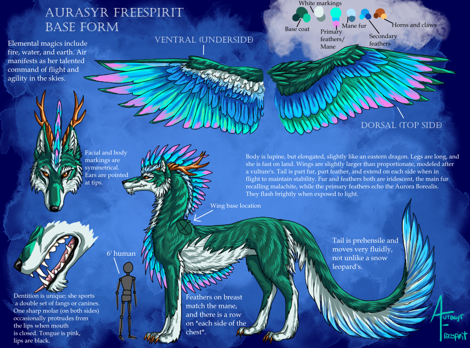 So this is the base reference form for my main OC, Aurasyr! She's an original species (however original you can call a wolf/dragon lol), and this lays out the basics. She's also a shifter, and has a lot of other forms, but most stay within a few base shapes: wolf, horse, dragon, and anthro versions of any of those.
