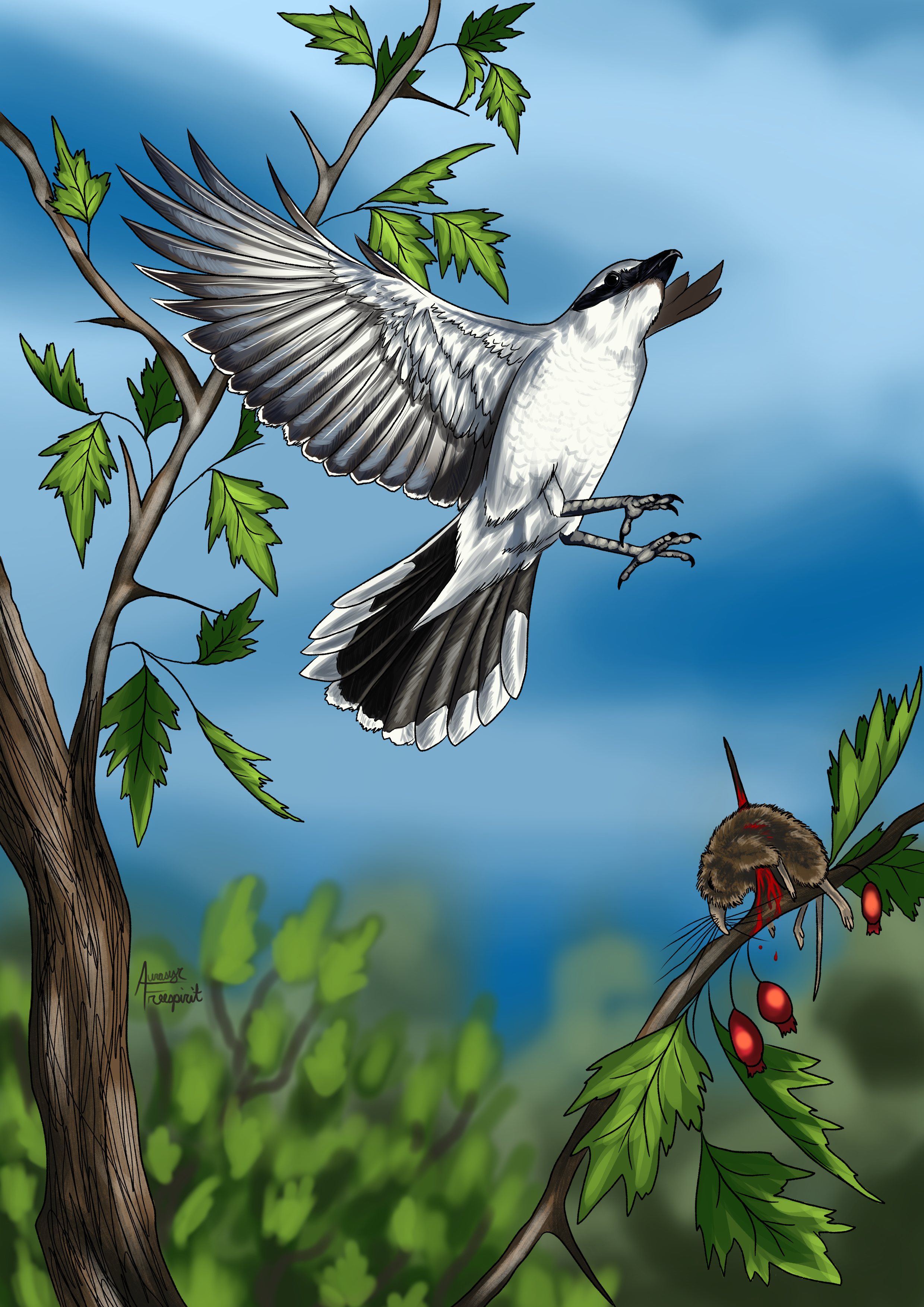 Do not repost, reuse, put into image generators, or otherwise redistribute."The words hung above But never would form Like a cry at the final Breath that is drawn Remember me, love When I'm reborn As the shrike to your sharp And glorious thorn" An illustration of the song Shrike by Hozier, partially inspired by a sighting of the same bird while at work some months ago. This song always makes me think of my dog, because when this single came out, that was around the same time I took him for his last big, proper walk. I'm not sure how to interpret the lyrics, but to me, that's what makes it beautiful. Inarticulate sadness and regret is what comes across. I have many regrets over the things I never did for my dog, and the ways I could have made his life better. I only hope he knows that. Anyway, hope you enjoy! Art (c) Aurasyr Freespirit Do not repost, reuse, put into image generators, or otherwise redistribute.0 Comments 0 Shares 5 Views -