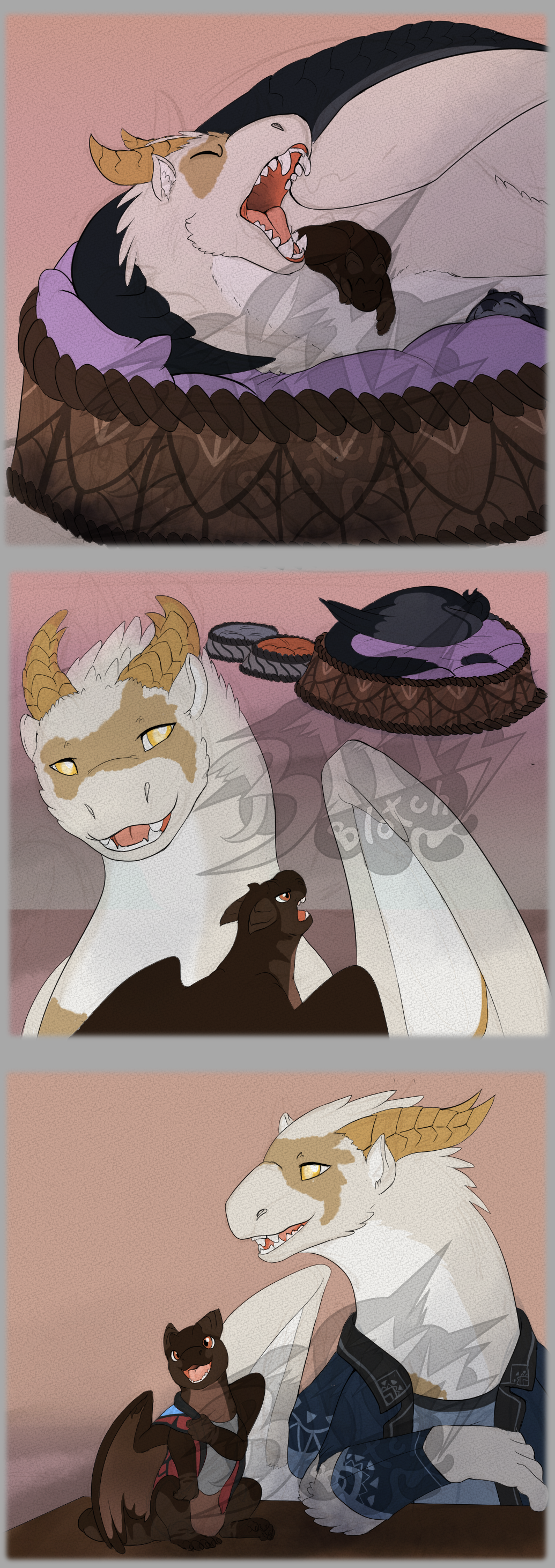Ceda being happy to distract her while he gets ready to go out with her. Encouraging her to try on her new uniform. Planning to keep her active and busy. Young fire dragons tend to be a little rambunctious and it will get worse as her flame organs develop. Instilling good habits needs to start early. From exercise to socialization.Despite having small beds of their own, the girls are still young enough to be allowed to comfortably climb on their guardians. Sometimes, this is a response to a new environment, other times it’s because of a large warm fire dragon. However, this is often seen as a positive as the proximity to their guardian normally helps reduce stress to a youngling. While Valorguard are encouraged to be very early starts, Dreamweavers often wake up at a slower pace and Vhaari is not old enough to value when others want to sleep longer. Luckily, Ceda is big enough to wrangle her up before she was able to dive bomb Aster in the side... a lot. Ceda being happy to distract her while he gets ready to go out with her. Encouraging her to try on her new uniform. Planning to keep her active and busy. Young fire dragons tend to be a little rambunctious and it will get worse as her flame organs develop. Instilling good habits needs to start early. From exercise to socialization.0 Comments 0 Shares 31 Views -