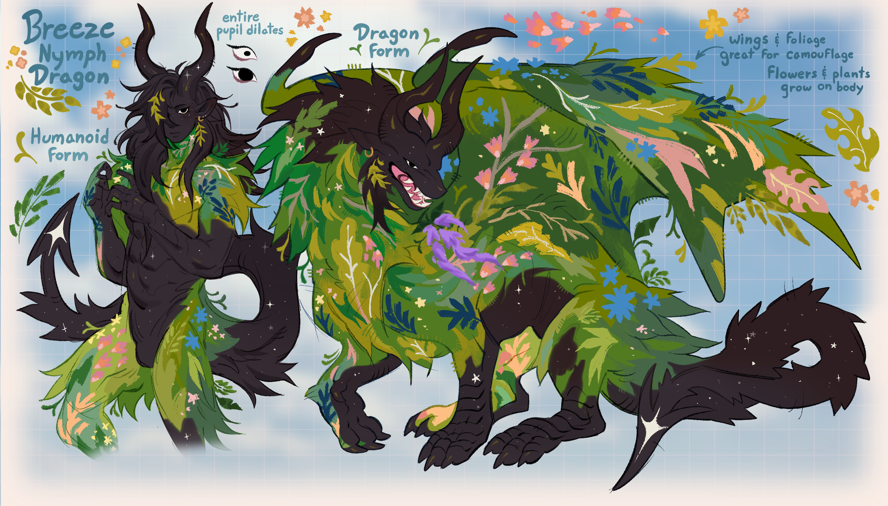a nymph dragon who guards an ancient forest. for as long as he lives there the forest will not die, even in the winter do the trees stay green and lush. he magically grows flowers and other plants wherever he steps. he's incredibly elusive being able to use the foliage growing on his body and wings as camouflage and he's very protective of his territory