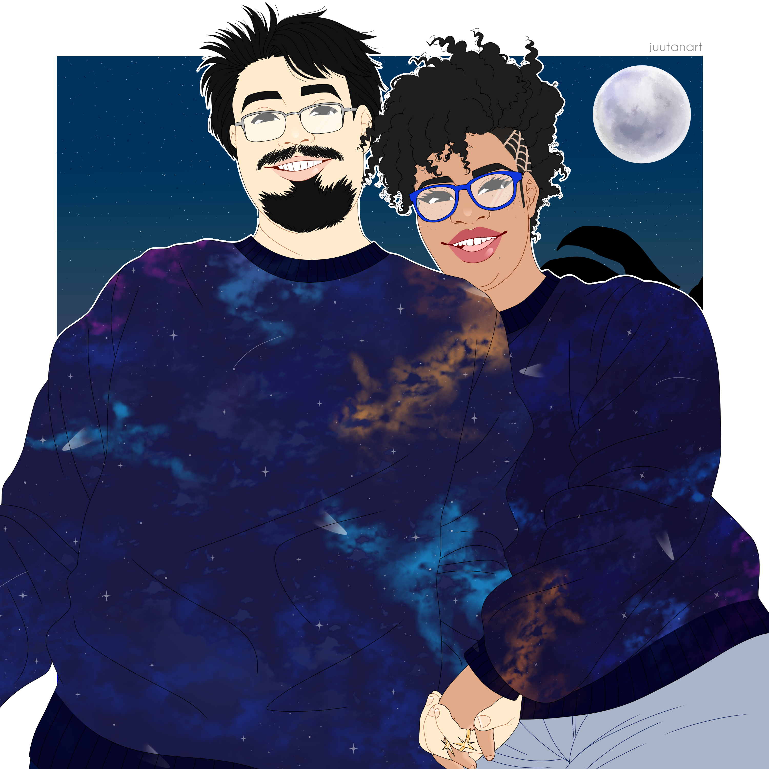 For Yule I wanted to Commission @juutanart for a couple Portrait of me and my partner, Morri. Which she was happy to oblige. We’re in matching Galaxy print sweaters, in the night winter sky, holding hands as the queer couple we are _(ISTG I love this enby with my heart you must understand)_ and we’re smiling at the camera (viewer).