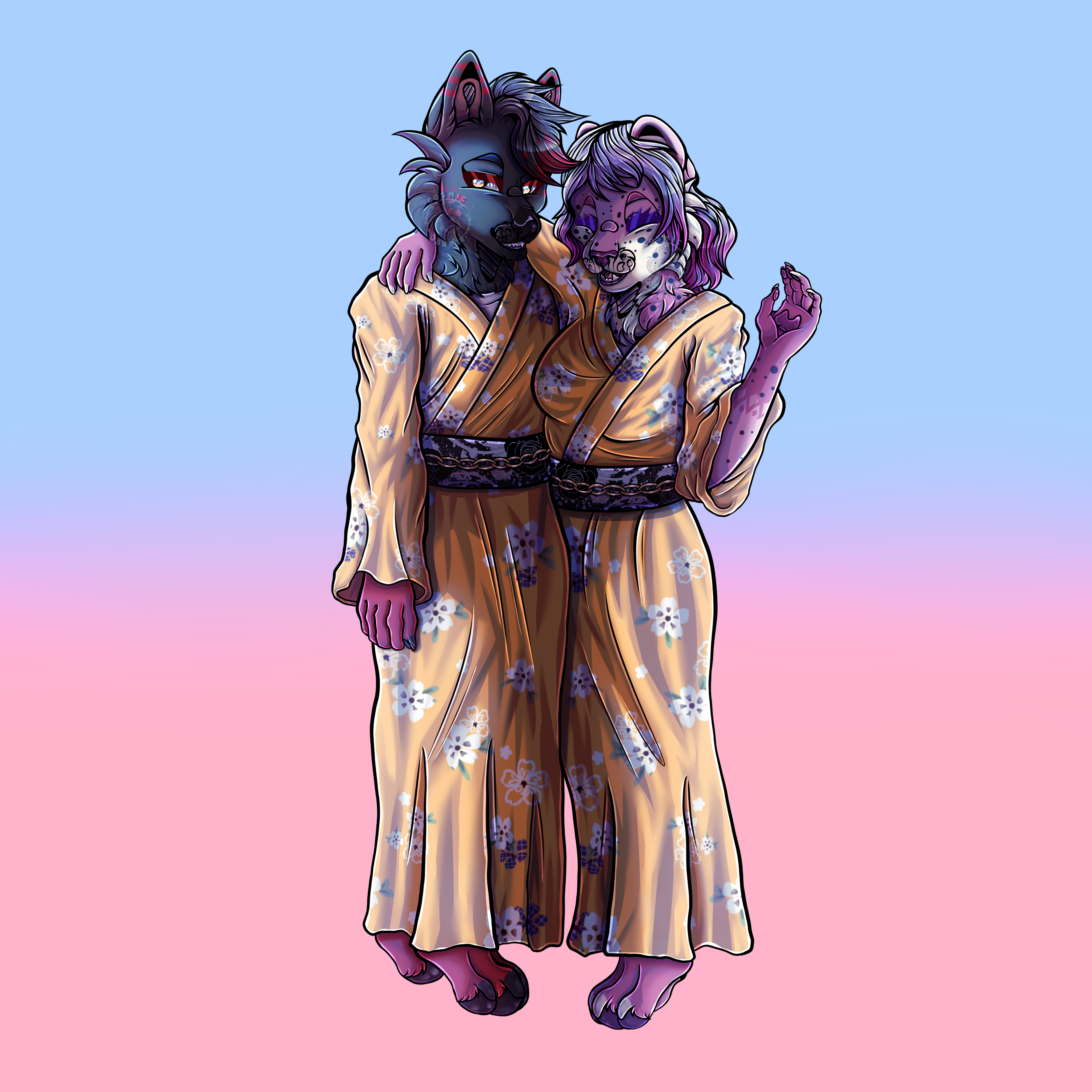 Advanced shaded anthro fullbodies w/ background for RealCrystals and their friend on discord of their fursonas dressed in kimonos. Thank you for commissioning, I greatly appreciate it!I