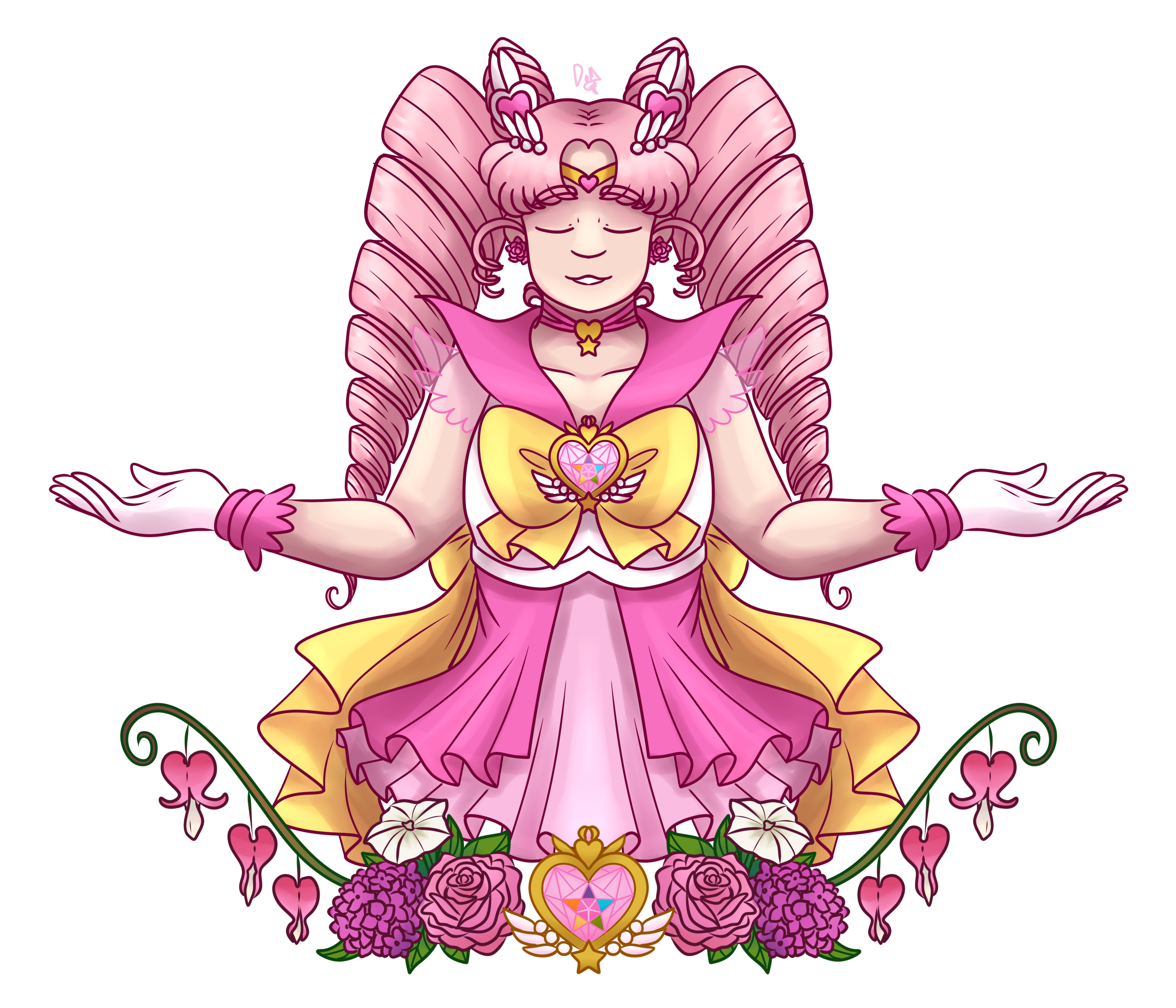 The second version is also up on my shop! Link [here!](https://dropsofmoonlightstore.threadless.com/designs/princess-of-the-future)it's only been the 30th for half an hour, but I'll celebrate it anyways! Happy Birthday, Chibiusa! A second version in a style inspired by the SMCrystal eyecatches. pink rose (admiration), hydrangea (false pride), moonflower (thinking of love), bleeding heart (fly with me) The second version is also up on my shop! Link [here!](https://dropsofmoonlightstore.threadless.com/designs/princess-of-the-future)0 Comments 0 Shares 3 Views -