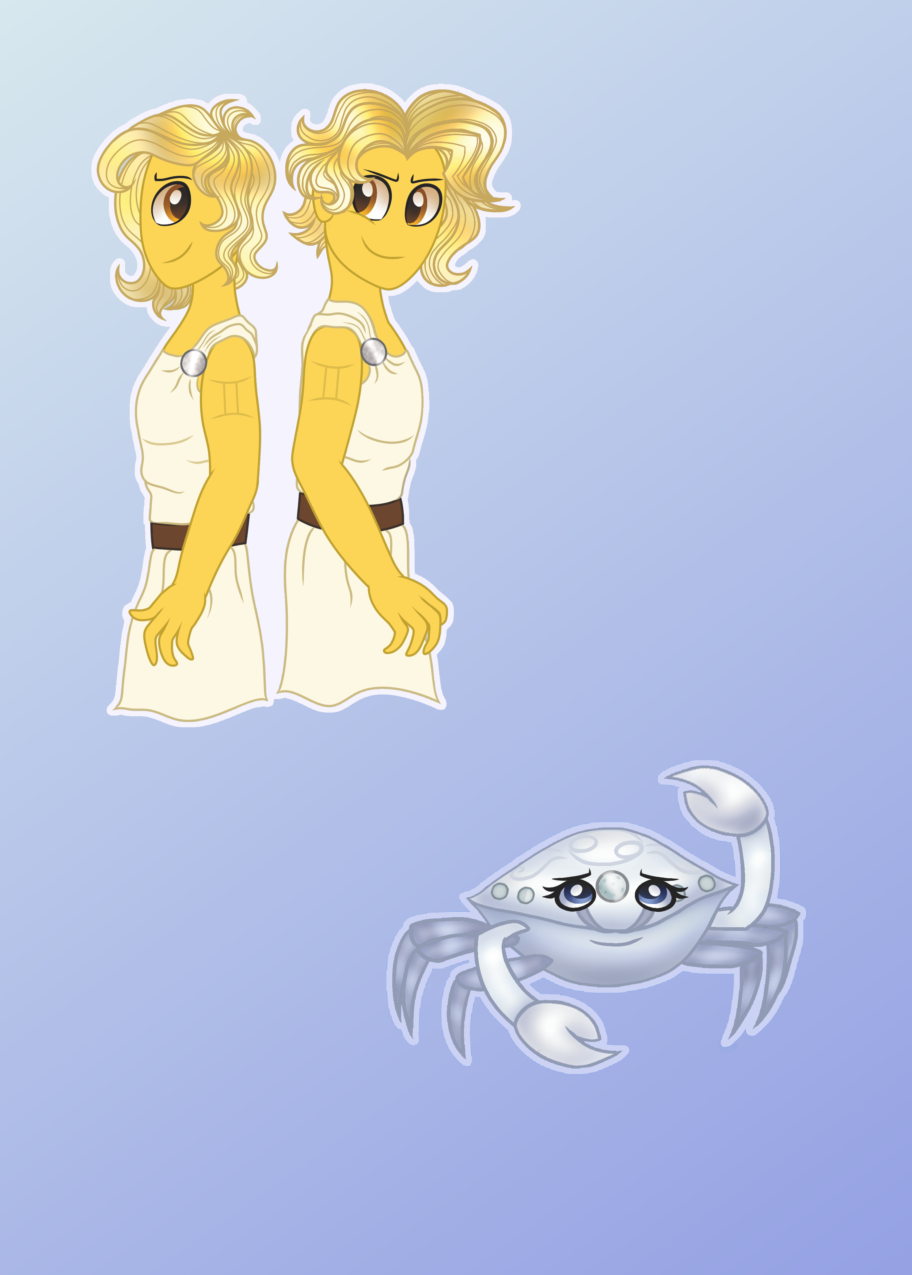 Also just to clarify in regards to Gemini- The left twin is Castor, and the one to his right is Pollux. I tried to incorporate a lightning bolt shape to Pollux's hairstyle in order to differentiate him more; this is based on Greek mythology where he is the biological son of Zeus. And since Castor is not a son of Zeus, I gave him more relaxed hair than his twin.