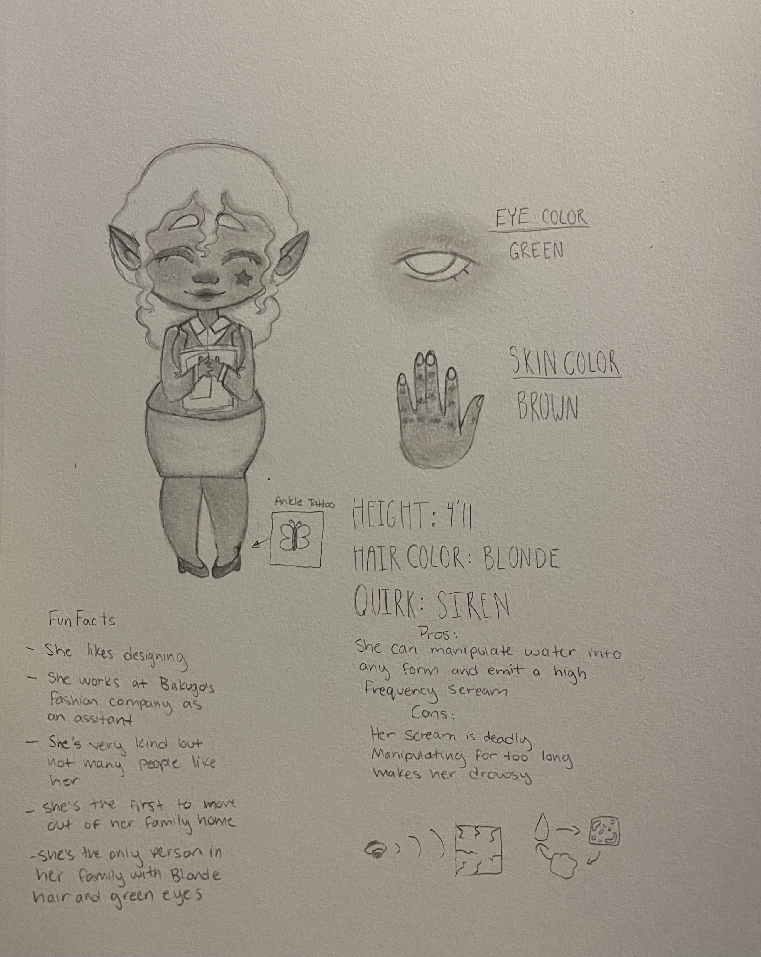 She has a butterfly ankle tattoo on her left ankleEye color: Green Skin color: Brown Height: 4β11β Hair color: Blonde Quirk: Siren Pros: She can manipulate water into any form and emit a high frequency scream Cons: Her scream is deadly and manipulating for too long makes her drowsy Fun Facts: She likes designing, She works for Bakugoβs fashion company as his assistant, Sheβs very kind but not many people like her, Sheβs the first to move out of her family home, Sheβs the only person in her family with blonde hair and green eyes. She has a butterfly ankle tattoo on her left ankle0 Comments 0 Shares 6 Views -