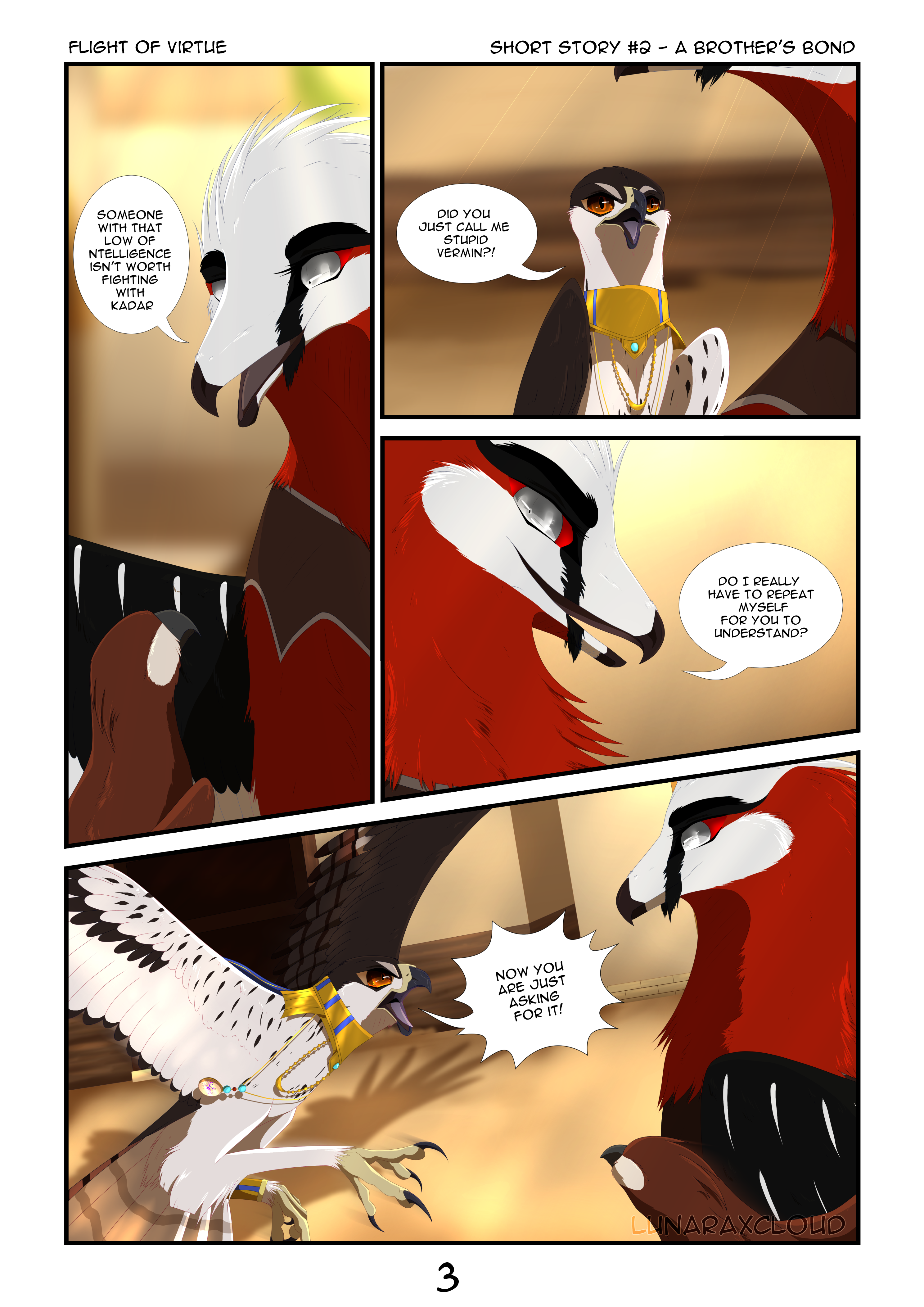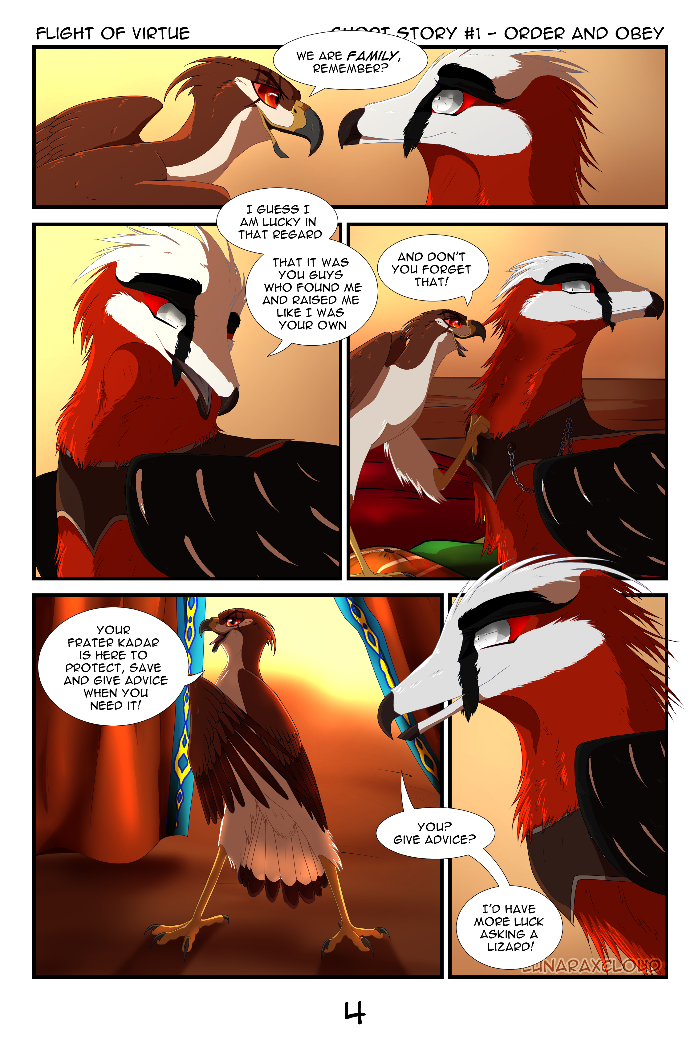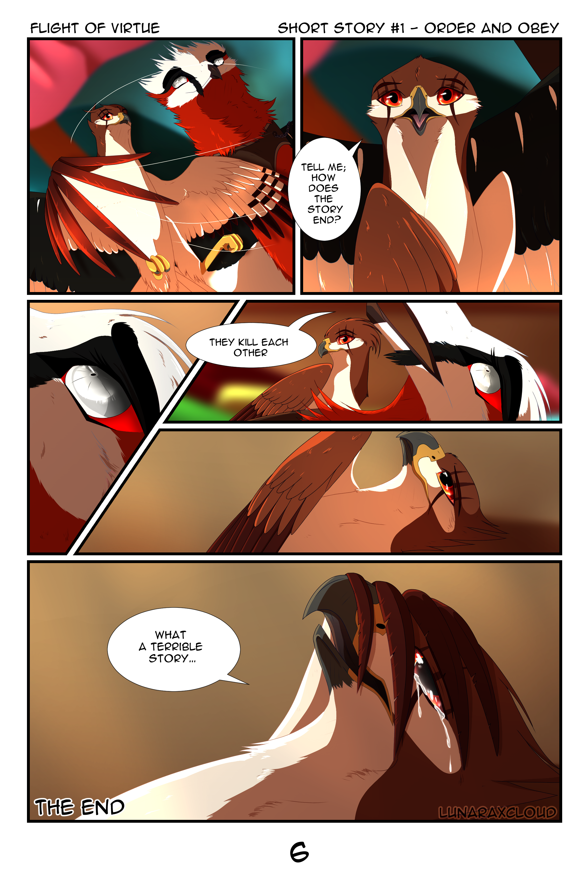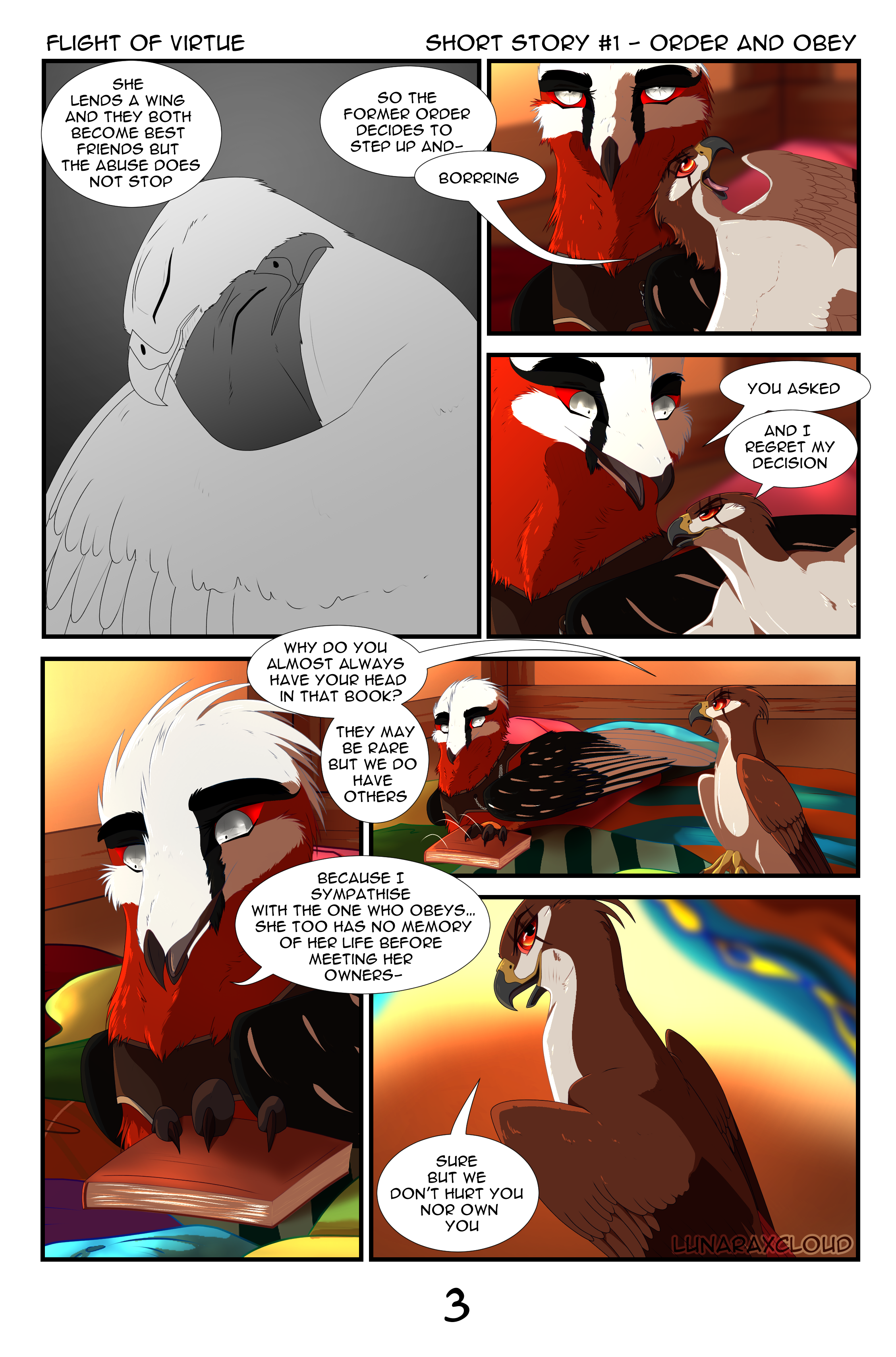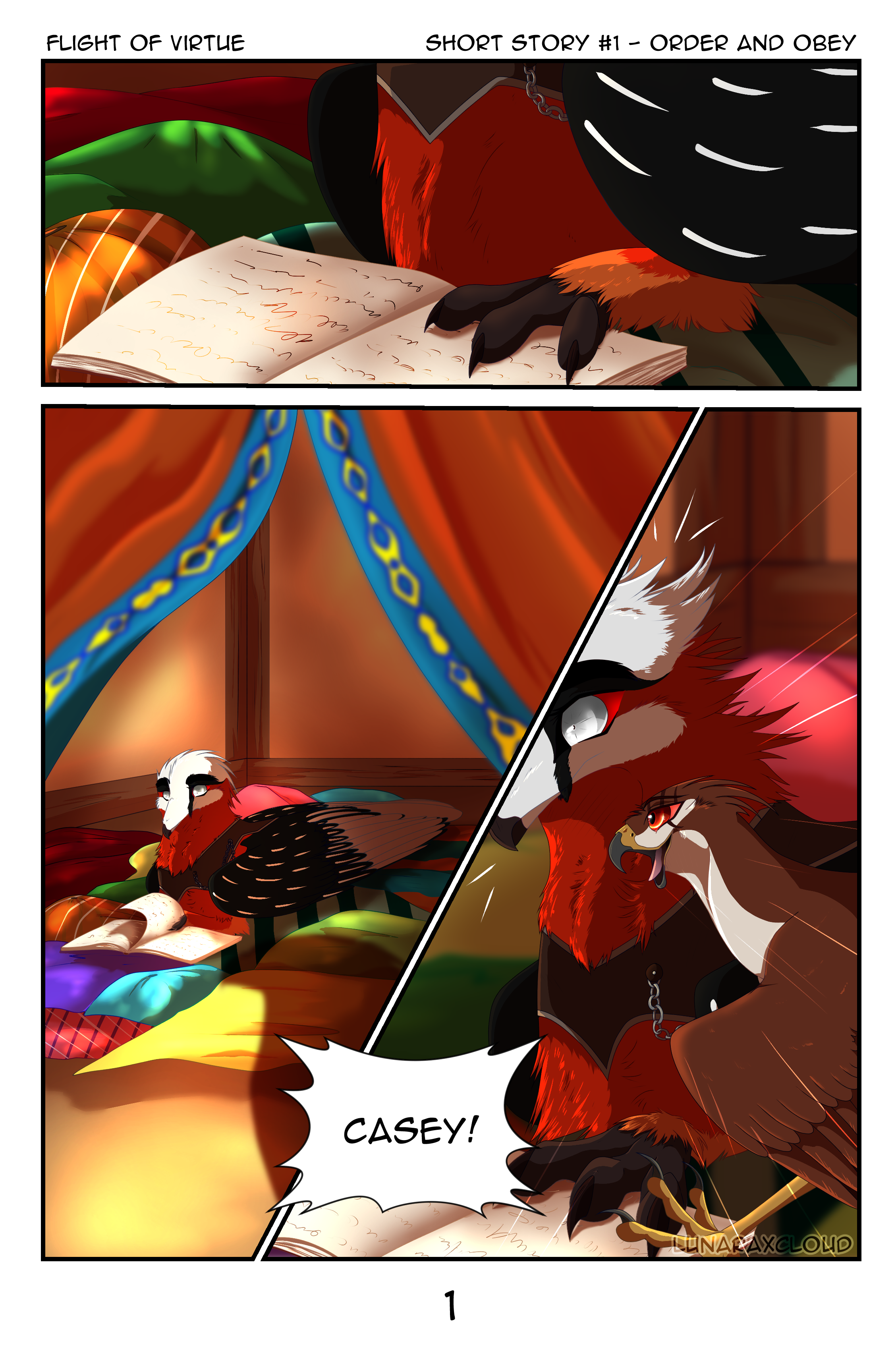 And the end of the short is here! I don't have a date for the 2nd short yet but I'm hoping to start it this month (Patreons will get it this month 100%) You can read more about the Flight of Virtue world here: https://flightofvirtue.weebly.com/ ___ **Order and Obey** Kadar finds Casimir reading a book and decides to interrupt confused as to why he's reading the same story for the 50th time. ___ Thank you for reading this short!