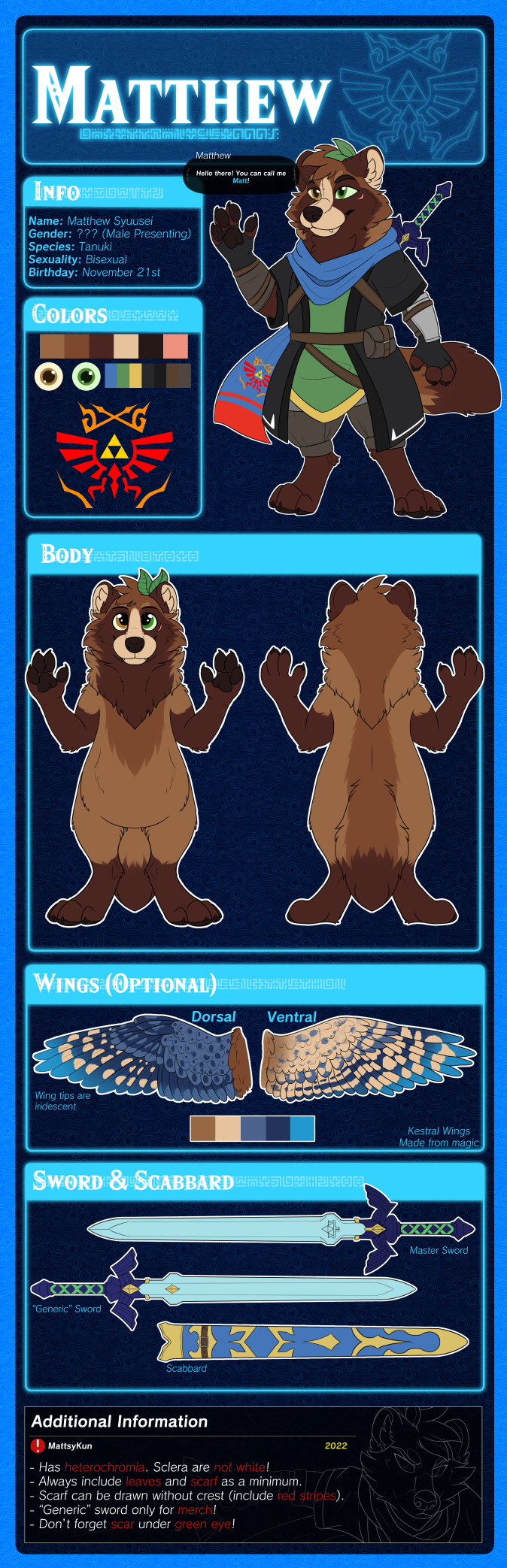 I love LoZ. It's actually kind of an accident that he ended up like this; I JUST gave him the scarf. Then I gave him the sword. Then I drew him with wings when I was sick. And then Kimiko and Hakkai happened and I just have my little Triforce Trio that I wanna write fic about. XDMatt's full ref sheet! (Though this doesn't include his Spirit Tracks hat that he just got today lmao) I love LoZ. It's actually kind of an accident that he ended up like this; I JUST gave him the scarf. Then I gave him the sword. Then I drew him with wings when I was sick. And then Kimiko and Hakkai happened and I just have my little Triforce Trio that I wanna write fic about. XD0 Comments 0 Shares 5 ViewsPlease log in to like, share and comment! -