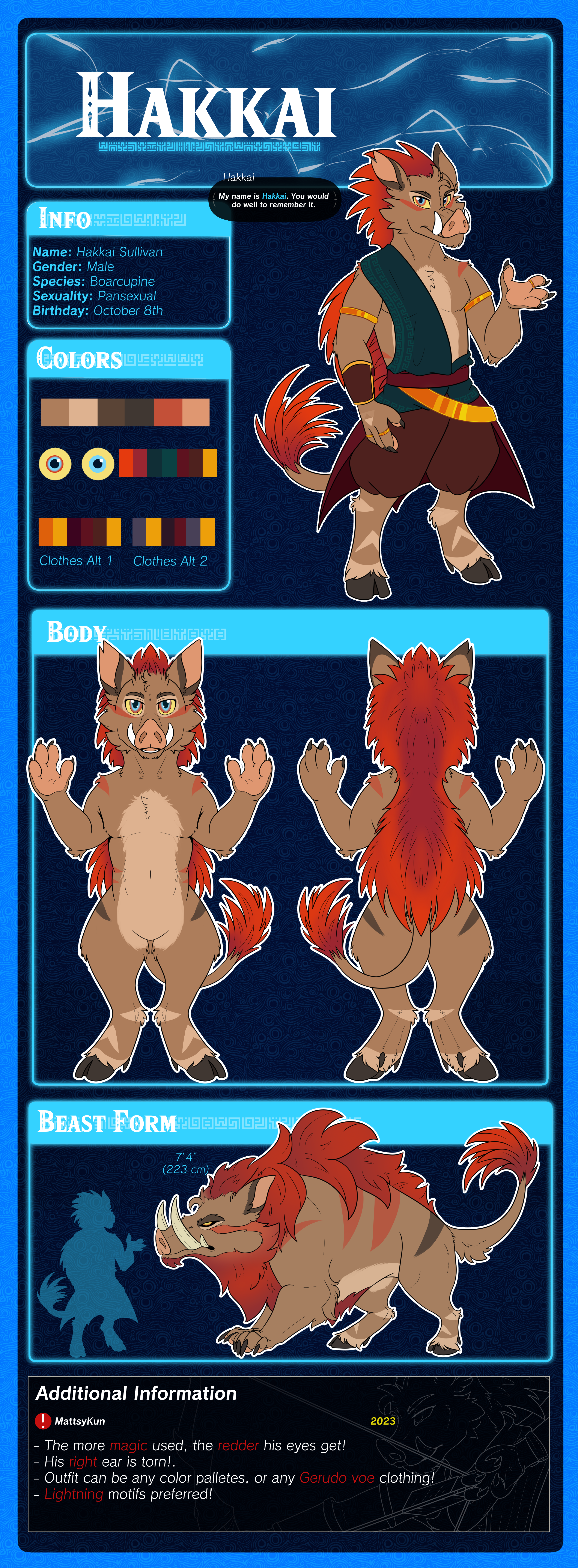 You can see even more info about Hakkai on his [Toyhouse](https://toyhou.se/18475236.hakkai-sullivan)!Finished my ref sheet for the wielder of Power, the Thief King Hakkai! When I first saw the adopt of him I HAD TO HAVE HIM. I knew he'd fit nicely as the third member of the Triforce Trio. Also, I didn't know I could draw feral boars (though, his front paws are more bear than boar, but a male bear is a boar, right....?) I'm also aiming to have a fursuit of him someday. Sorry, Matt, but being in fursuit with life-sized Swords of Despair sounds hot. You can see even more info about Hakkai on his [Toyhouse](https://toyhou.se/18475236.hakkai-sullivan)!0 Comments 0 Shares 8 Views -
