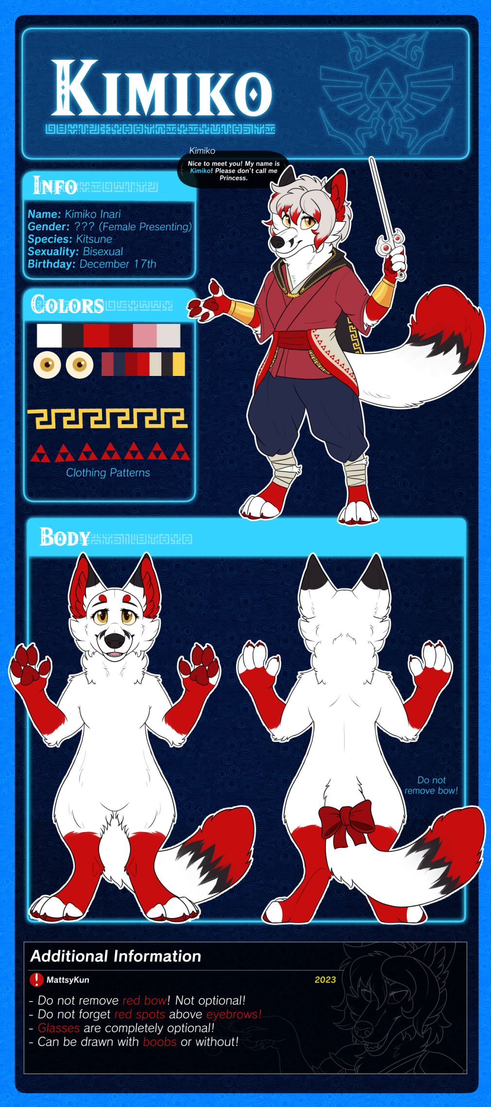 Or, read more about [Matthew](https://toyhou.se/11404388.matthew-syuusei) and [Hakkai!](https://toyhou.se/18475236.hakkai-sullivan)And with Kimiko, the Triforce Trio's references are complete! Kimiko is my main 'sona and I love her very much Kimiko's clothes lean more towards Sheik than Zelda because she wouldn't let me put them in a dress. I tried, y'all. Unfortunately I coudn't think of anything else to add to her ref sheet, so it's short. :P Someday I'll expand it. You can read more about Kimiko on her [Toyhouse!](https://toyhou.se/7024581.kimiko-inari) Or, read more about [Matthew](https://toyhou.se/11404388.matthew-syuusei) and [Hakkai!](https://toyhou.se/18475236.hakkai-sullivan)0 Comments 0 Shares 5 Views -