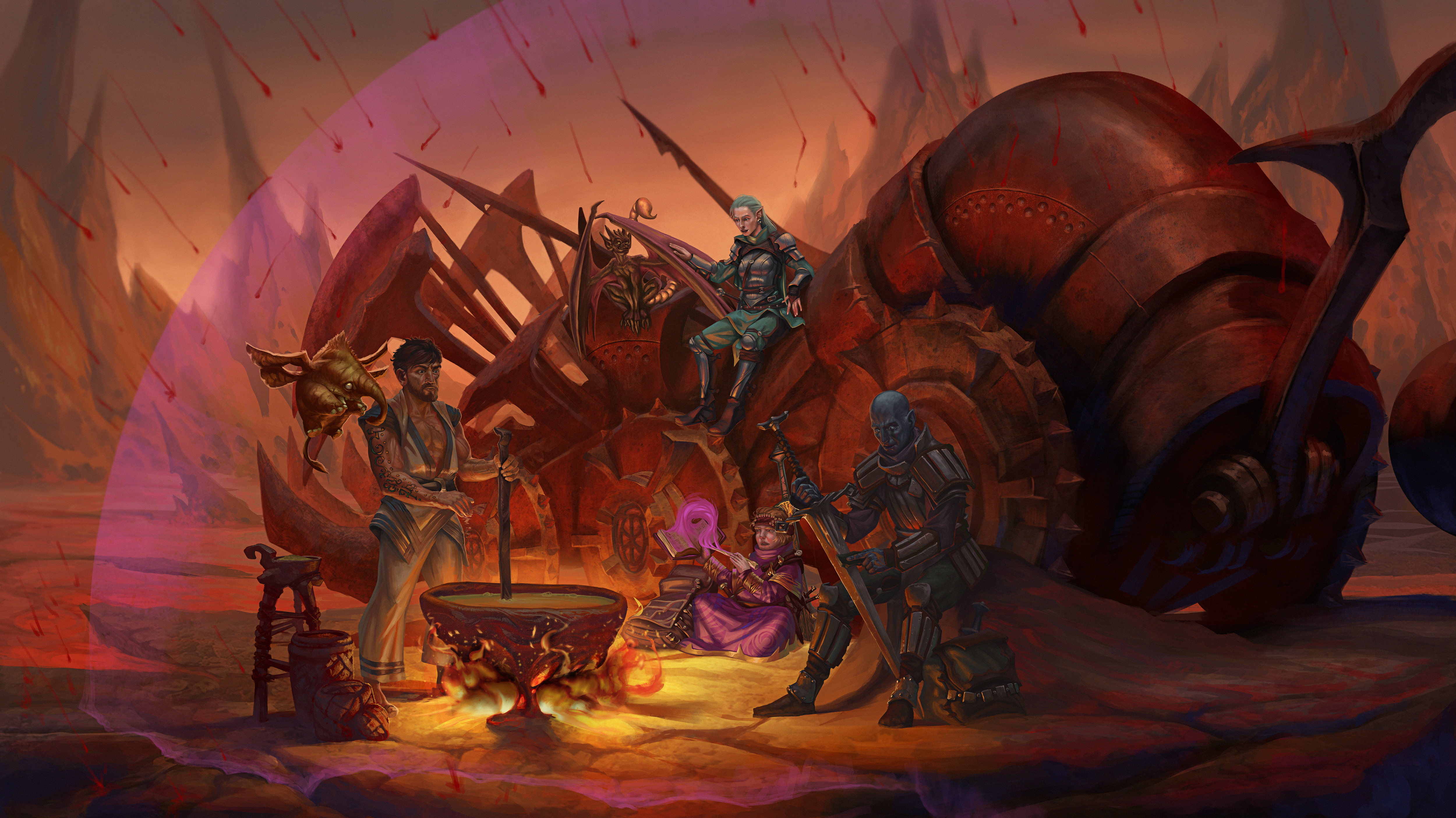 Descent into Avernus commission for Layne J. 4 PC's ( Spencillius Mandrake, A thirteen year old Kalashtar Wizard; Gibby, Goliath Fighter; Fenric, Wood Elf Ranger; Kass, Human Fighter ), an Imp, and a Hollyphant are relaxing inside of a small, see-through dome. They rest on top of an infernal machine and look out upon the hellscape around them while they relax in safety.