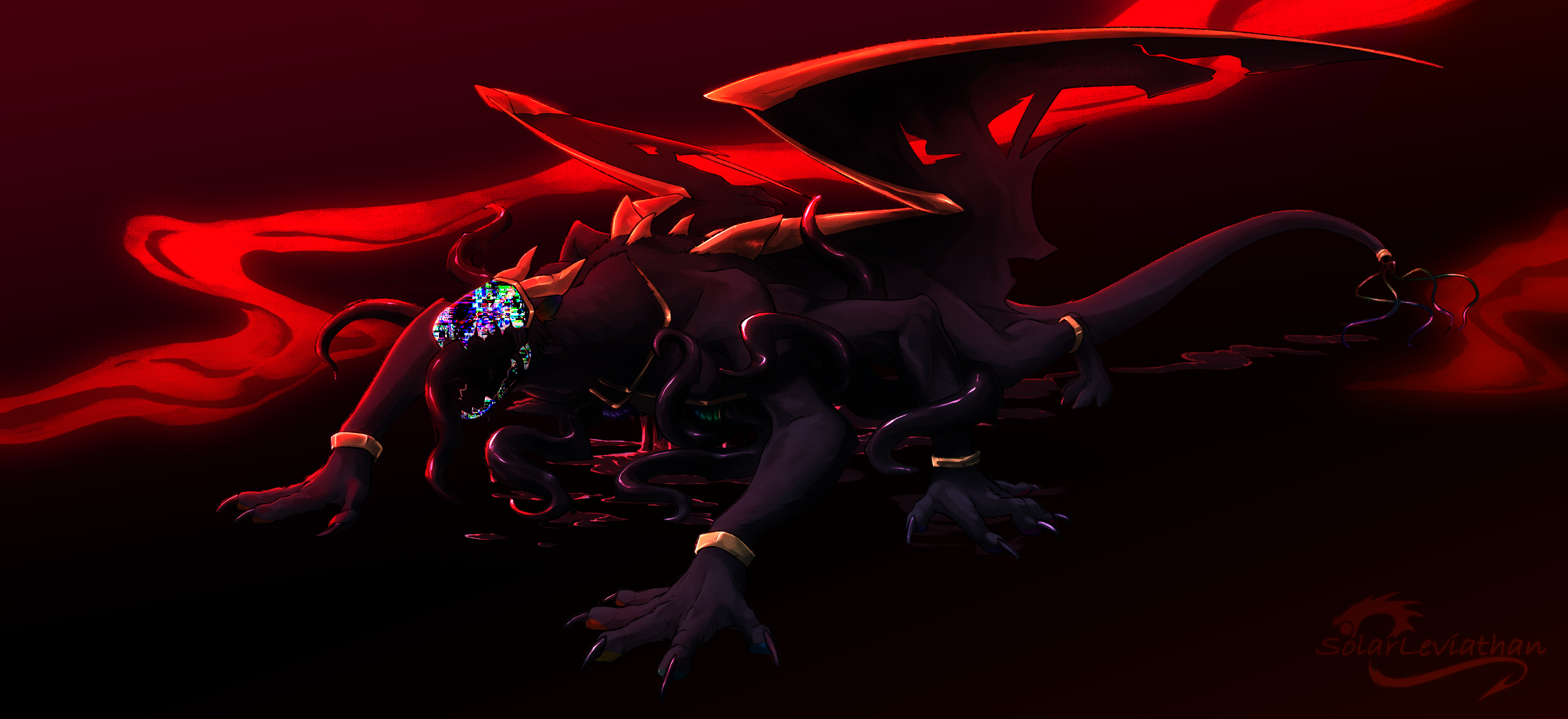 A piece I did for ItsThirteen on FlightRising. Their gooey protogen presumably escaped containment. Probably. The protogen doesn't contain any real gore/blood, the red is only a reflection of the glowing red smoke/steam on the blackish goo.