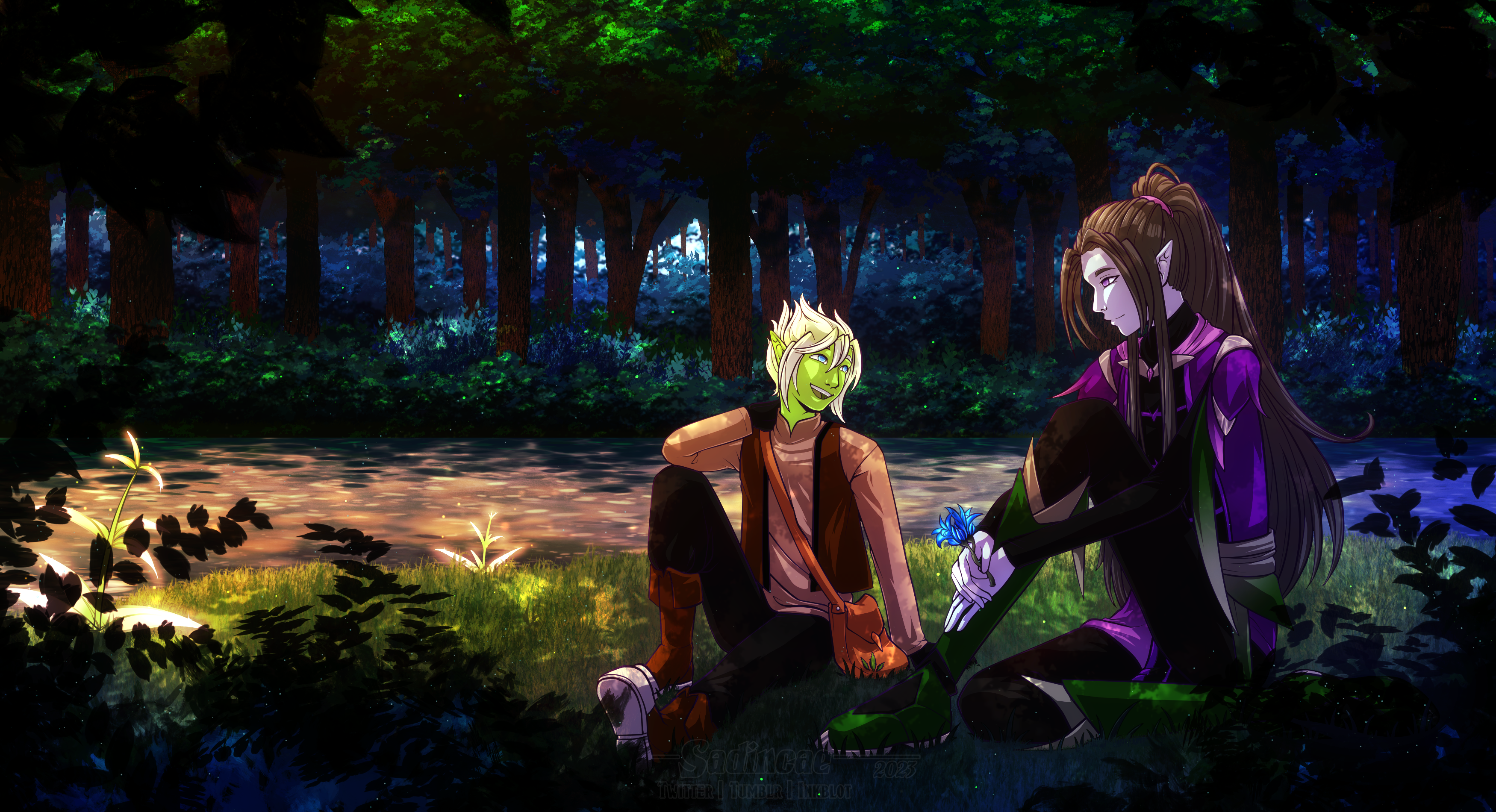 “Thank you.”It had been only a year and a half since she'd left her homeland of Tír na nÓg, but it somehow felt much longer than that to Keeva. She didn’t hate this strange land she was now forced to live within; Hadreon was rather nice, all things considered, but it wasn’t her home. This sense of loss bothered her in the very beginning, of course, but she could push those thoughts and feelings aside for a time. The longer she found herself away, however, the harder it became to ignore the aching feeling that had made a home of its own within her. This was further worsened by Lan. She knew that he could feel what she did through their link as summoner and eidolon, at least to some extent. It was obvious he was trying to help her as much as he could. He would listen, distract her, keep her moving and her mind on other things. It only did so much, however. Eventually it seemed to Keeva that he’d grown tired of it. He wished to be unfettered from her, he would say. Keeva, of course, would oblige to these requests, although it did not come without an even sharper ache within her as the link that bound their lifeforce to one another shattered for a time. _He just wants to be happy_, she thought to herself, smiling despite the loneliness. _I can’t deny him that._ With each request to sever their link it became harder for her to say yes, especially in those horrifying instances where he failed to return to her in time. When she felt what little connection they did have remaining snap completely, that loneliness consumed her utterly until he finally recovered from as close to death as an eidolon could reach. There were a handful of times where she did finally deny his wishes, but after seeing how distraught Lan became… she had to relent. She wanted him to be happy, she honestly did, but why did he want to leave her so often? Although he seemed eager to talk with her when they were together, his own thoughts and feelings were significantly more guarded than her own. She didn’t know what he truly felt. She thought about asking why, but decided against it. It felt easier not to know. There eventually came a day where Lan, after returning much sooner than usual, seemed almost bursting with excitement. “I have something I want to show you!” Keeva was suspicious, but before she could say anything, he had swept her off her feet and flew away as fast as his mighty wings would allow. He dipped into the forest as soon as he spotted an entrance large enough within the branches. Farther and farther into the woods they swiftly flew, bursts of stray sunshine shining through the canopy of leaves acting as their guiding light. After a while, he slowed to a stop, landing in front of a strange archway of silvery-green leaves. Keeva gave him a curious look that seemed to make Lan even more giddy with excitement. “Go in!” he said, carefully setting her down on the ground. “It’s safe, I promise.” Her curiosity got the better of her. Keeva walked forward through the arch of leaves, which seemed to quiver as she passed by. It seemed almost to be a hallway, continuing on and on, twisting every so often until she had no idea which way she was facing. She gave a wary glance behind her to Lan, who merely grinned widely in response. Finally, she saw what appeared to be the end of this passage, the suns’ light shining brightly on the other side. She stopped once she reached the edge of the leaves and stared with wide eyes, uttering a small sound of surprise. It was as if a piece of home were lifted and dropped within this little clearing. Flowers of all kinds littered the ground, climbing up into the large trees that acted almost as walls. An abundance of color lay everywhere one looked. She lifted a hand as she passed underneath one of the more willowy trees, lightly brushing through the strands of purple leaves and flowers that dangled delicately from the low-hanging branches. She walked as if in a daze and sat herself in the middle of the blue-green grass where the flowers were small and seemed to dance in a gentle breeze that could not be felt. Lan joined her, seeming pleased with himself. There were no words shared between them as they sat. It was the pleasant kind of quiet where you felt warm and safe, no cares in the world to weigh you down. “I could feel you were homesick,” he finally said with a soft smile. “It took me a while, but… I hope what I found is worth the pain I put you through.” She leaned against him, resting her head against his arm as she settled into a hug. “Thank you.”0 Comments 0 Shares 66 ViewsPlease log in to like, share and comment! -