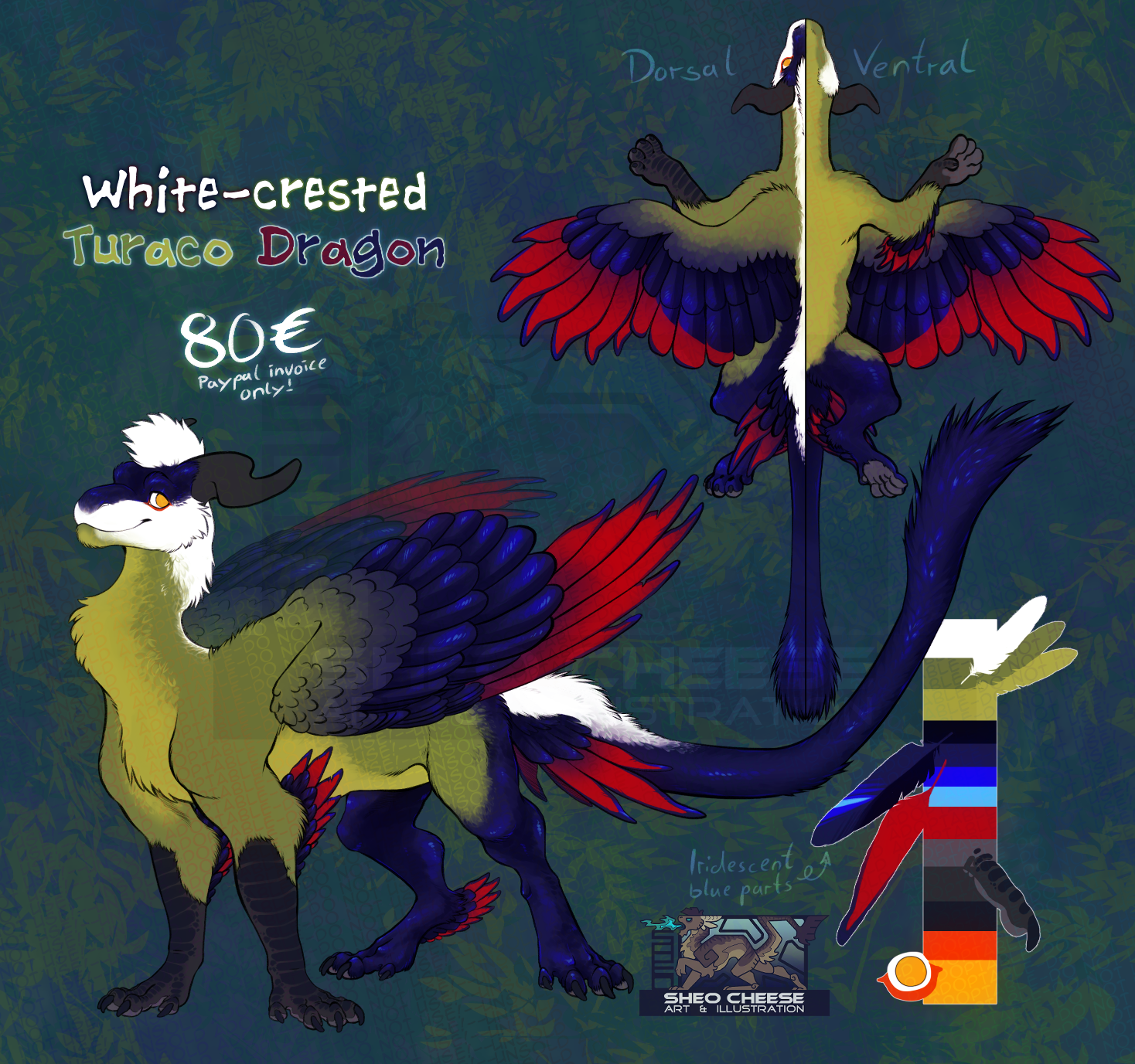I'll update this upload once the design has been sold.A dragon adoptable inspired by the White-crested Turaco bird! 80€ flat, paypal only, comment or DM me to claim. My adoptable ToS: https://sheo.carrd.co/#adoptabletos I'll update this upload once the design has been sold.0 Comments 0 Shares 30 Views -