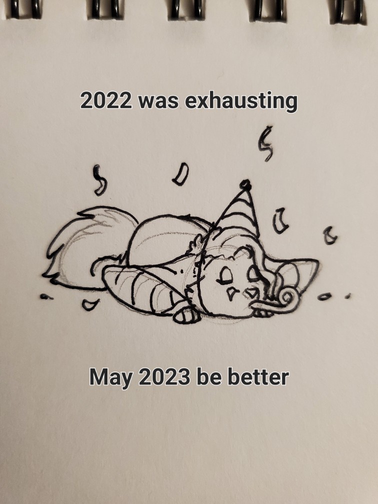 Shows a small fox like creature with large ears, laying down, tail put behind. Wearing a party hat and blowing a noise maker. Confetti around them. Eye closed and looking tired. (Black ink on white sketchbook paper.)Alt text: Reads "2022 was exhausting. May 2023 be better. " Shows a small fox like creature with large ears, laying down, tail put behind. Wearing a party hat and blowing a noise maker. Confetti around them. Eye closed and looking tired. (Black ink on white sketchbook paper.)0 Comments 0 Shares 25 Views -