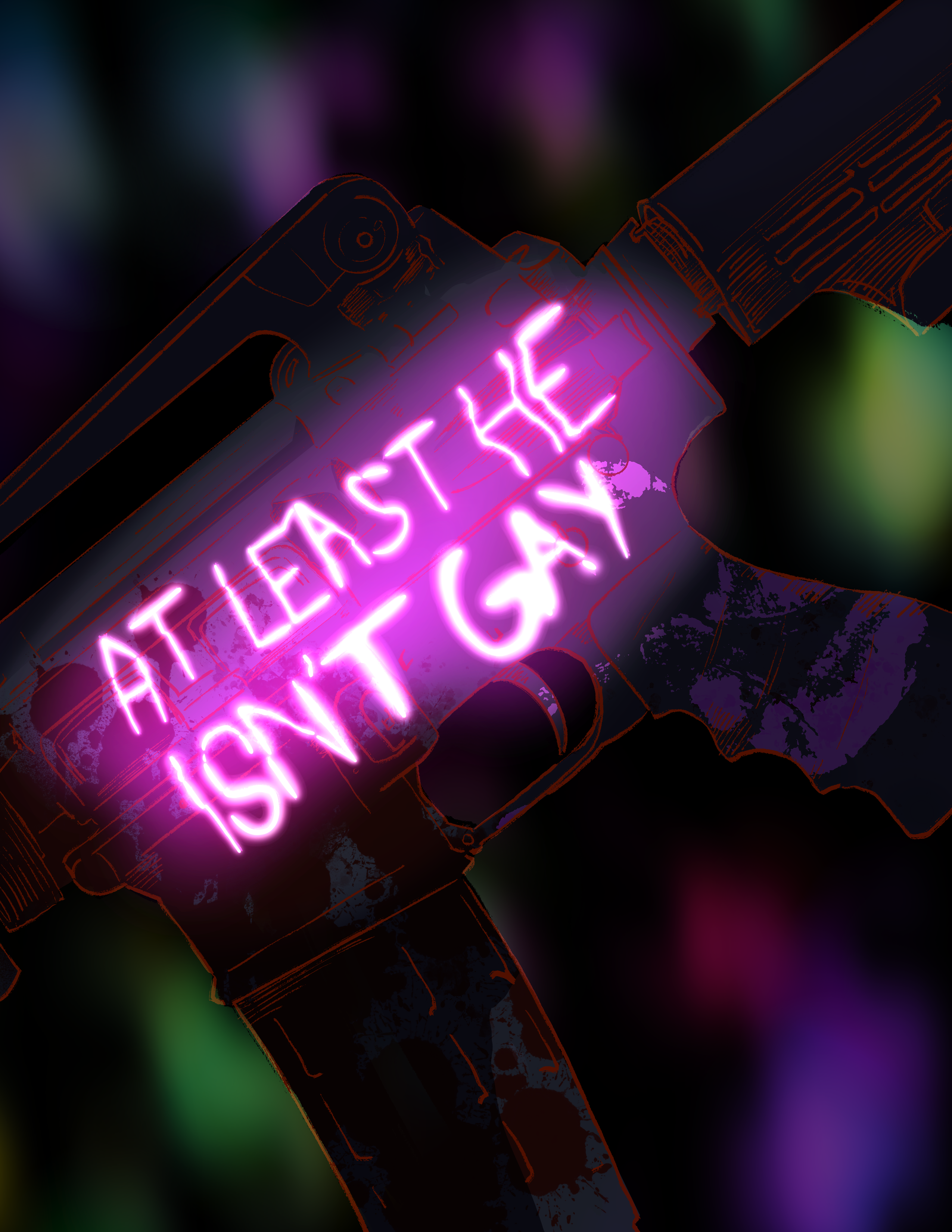 Here's a digital piece I did for my digital art class; the assignment was to create a piece of editorial art, based on a recent news event. It's an AR-15 rifle system, covered in blood, with neon print carved into the side, reading "At least he isn't gay". Interpret as you will.When he was informed that his son had murdered five people in a gay nightclub, the Club Q shooter's father was more upset by the idea that his son might have been gay than by the fact that he had slaughtered innocent people. He said he was relieved to hear that his son wasn't gay. Here's a digital piece I did for my digital art class; the assignment was to create a piece of editorial art, based on a recent news event. It's an AR-15 rifle system, covered in blood, with neon print carved into the side, reading "At least he isn't gay". Interpret as you will.0 Comments 0 Shares 4 Views