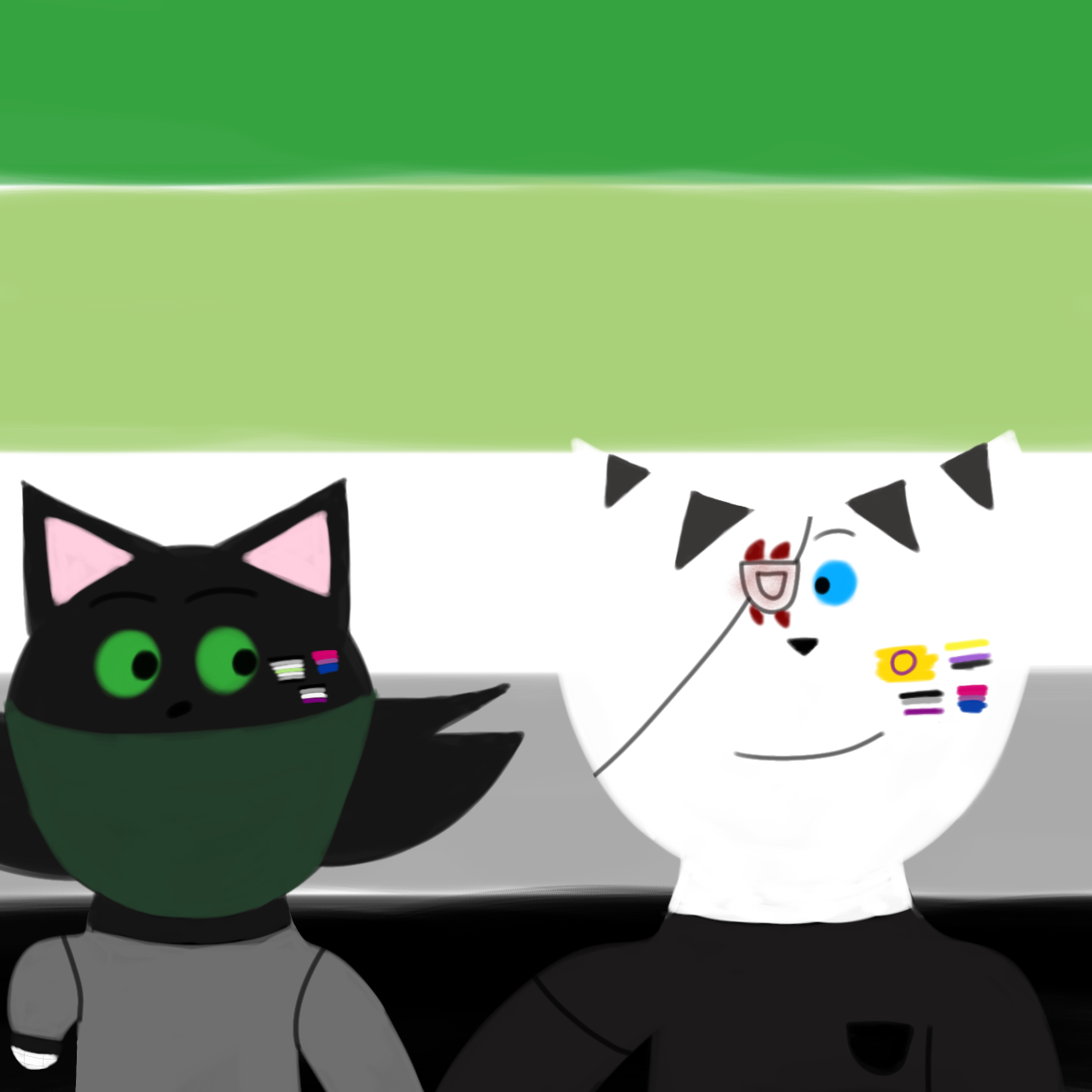 Image description: Drawing of Minea and Jupiter looking at each other while they are holding hands. The background is in asexual flag's colorsImage description: Drawing of Minea and Jupiter looking at each other while they are holding hands. The background is in asexual flag's colors0 Comments 0 Shares 28 Views