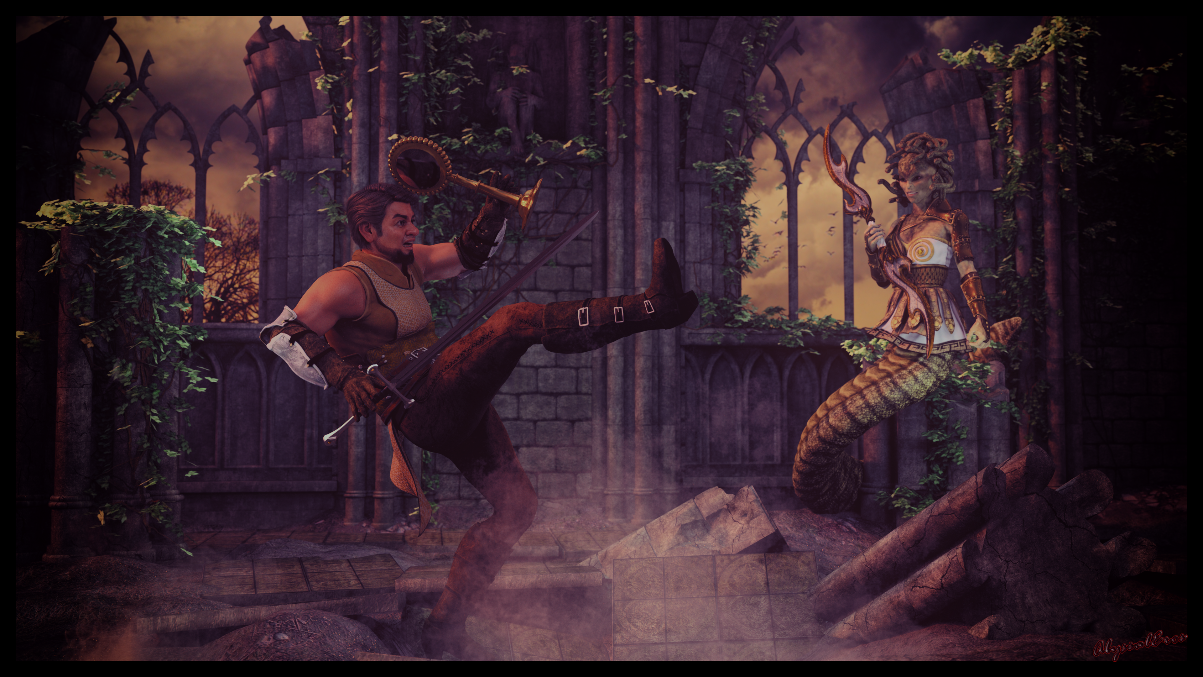 Rendered in Iray with DAZ 4.14. Postwork in Photoshop.One slight misstep and all the neat tavern plans to sneak up on the Gorgon go awry in a single moment. Unable to keep his footing anymore, he tumbles backward, losing the grip not also on his grandfather's sword but also on the precious hand mirror he "lent" from his wife. He does not know what scares him most, his inevitable death, his wife's annoying bickering over the broken mirror, or the fear of getting turned to stone in this awkward pose, thus keeping his embarrassing demise petrified for all eternity. --- Rendered in Iray with DAZ 4.14. Postwork in Photoshop.0 Comments 0 Shares 69 Views -
