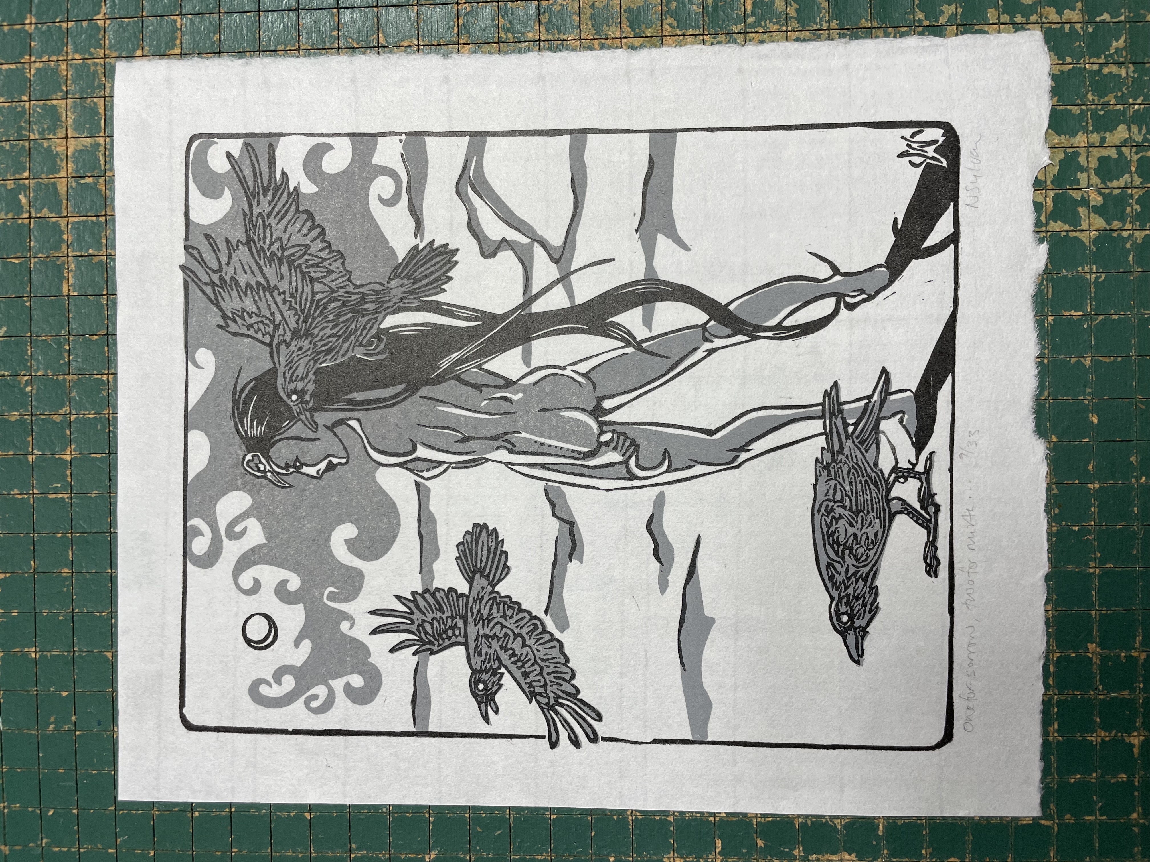 Two colour linocut print of a witch and her ravens.Two colour linocut print of a witch and her ravens.0 Comments 0 Shares 6 Views