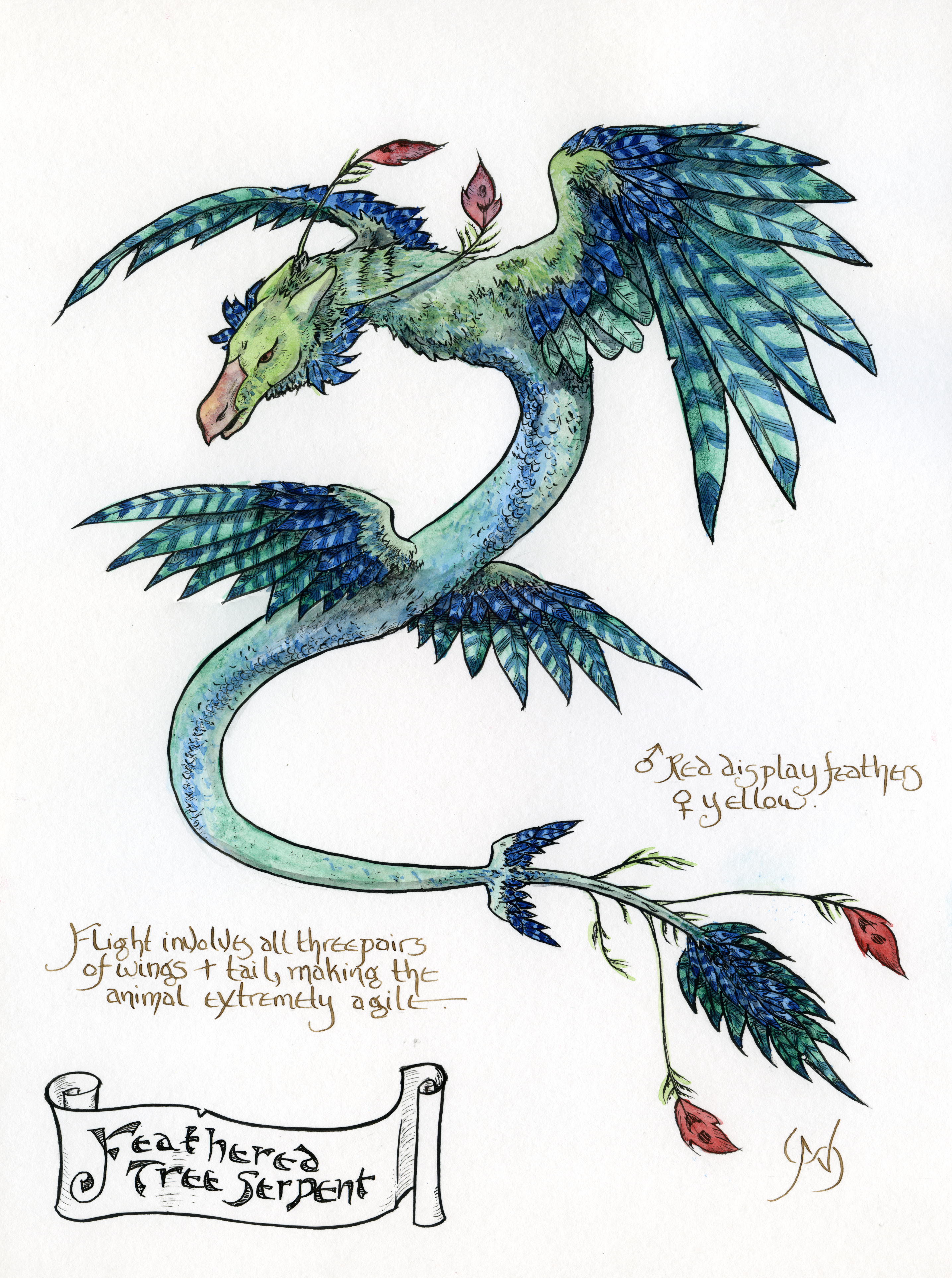 The feathered tree serpent is a small, dragon-like creature found in the forests and mountains of the Isle. They are shy and flighty, but can be tamed with patience. Some mountain communities raise them for their tough, beautiful leather, but they are prized by the bird folk as hunting companions. (See the Three Realms, Nine Monarchies series by Nicole Silver, beginning with _A Vision of Air_.)Pen & ink and watercolour on multimedia board. The feathered tree serpent is a small, dragon-like creature found in the forests and mountains of the Isle. They are shy and flighty, but can be tamed with patience. Some mountain communities raise them for their tough, beautiful leather, but they are prized by the bird folk as hunting companions. (See the Three Realms, Nine Monarchies series by Nicole Silver, beginning with _A Vision of Air_.)0 Comments 0 Shares 4 Views