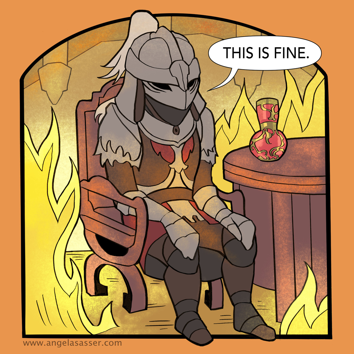I was going to catch up on work this weekend, but then I did this most important work for the cultural zeitgeist of Elden Ring instead! Because KC Green's "This is fine" comic was all that was going through my mind during the catastrophic events of the late game where we were expected to still carry on with our day to day while everything else was happening.