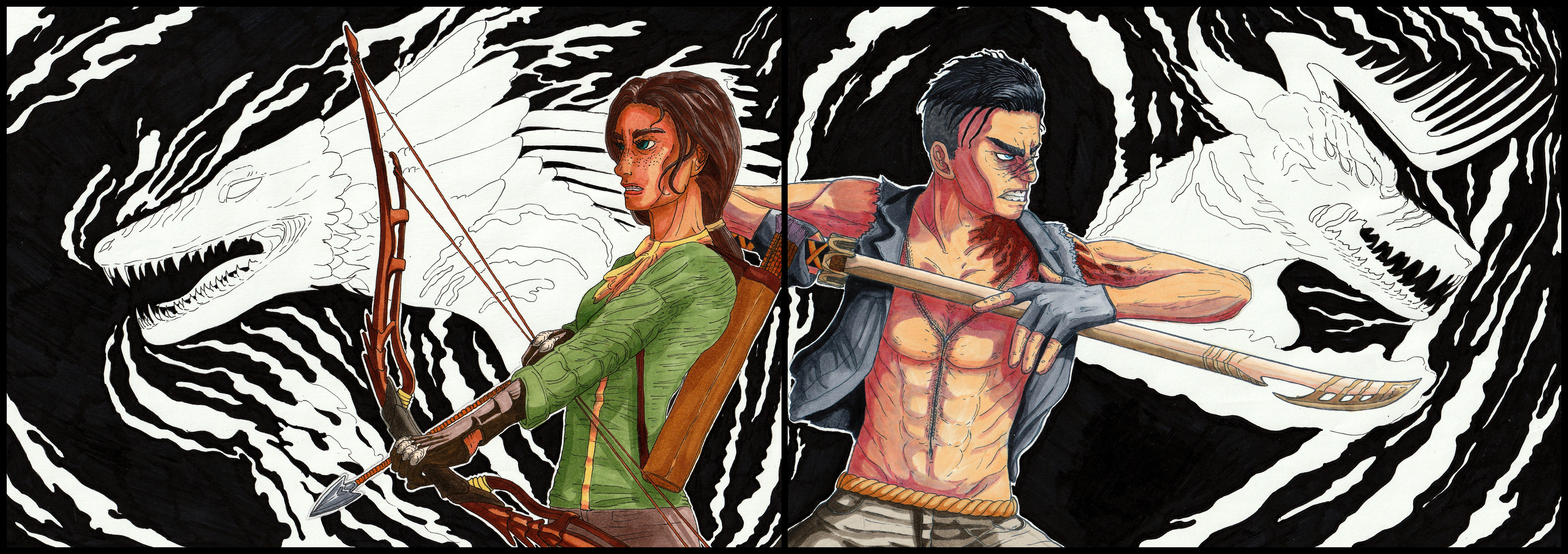 An artwork I made connected to @acayth and my story project, depicting two of our main characters in our current story line, Ealendyr (left) and Ceto (right) . I hinted their beastforms in the background as well. I love those two as a duo and I hope you will as well :3