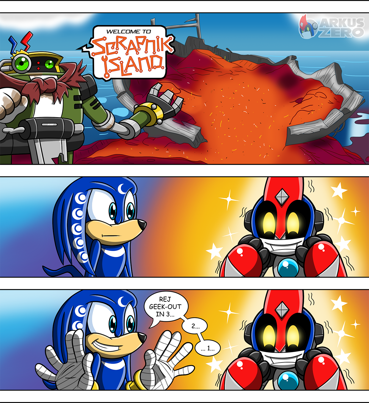This is a redraw of one of the pages in the Scrapnik Island mini series by IDW. For the longest time Rej has had an affinity with scrapyards and junk parts having originally been made out of random junk himself. While nowadays he looks more pristine thanks to upgrades and general maintenance, he'll always be a Junk-Bot at his core. So when I read the comic about an island where broken down and cobbled together Badniks lived in peace, of course I had to express how Rej would react for he would love the place. If he didn't have his friends within Team Eclipse he would move to the island for good to be with others like him.