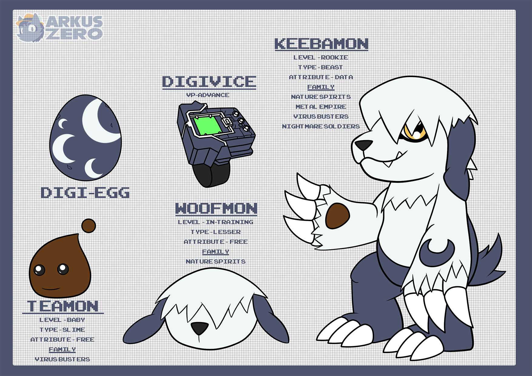 Digimon Digital Monsters (C) of BandaiDuring my teens, I became a big Digimon fan the first time I saw the anime series. Me and my friend liked the premise as much as we liked Pokemon. Though it wasn't until Tamers came around that we had the inspiration to try and design our own Digimon. Originally my own partner was my take on a Rookie Level for Tyranomon so a small red dinosaur with green spines I named Rexmon. His evolution went the predictable route of "Bigger Dino->Cyborg Dino->Warrior Dino". I wasn't very creative back then but I still think back to him fondly. After that I simply adopted the idea of just picking an existing Digimon as a partner so I went with the Andromon line as my main choice especially in the games. But recently I've been seeing a lot of creative Digimon designs by fans, most of them adoptables (and one of my online friends also made his own, so he was a big inspiration). It got me yearning for my own unique partner, but none of the available adopts were hitting a cord for me, so I decided to try and design one myself again. Initially I thought of giving Rexmon another go over but it didn't work out as so many others have done their own takes on an alternative Tyranomon line. Eventually I got a wave of inspiration when I thought about my favourite animals, Wolves, but I wanted something different from the Gabumon line. After thinking some more I remembered my favourite dog breed, the Old English Sheepdog, and boom I had my design planned out. I wanted to go for the classic Rookie body type of being short and stocky with three fingered paws, but with shaggy fur like the sheepdog. Coming up with the In-Training design was simple, and I think he turned out cute. And of course the Baby is the basic Blob Drop look. The name Keebamon is based on the Welsh word for Puppy "Ci Bach" but spelled out to get the right sounds. Was also tempted to name Woofmon the Welsh word for "Woof" which is "Wif" but felt that would sound too silly. And Teamon just because I'm British and I like Tea XP. The Digivice design is of the original V-Pet but slotted into a 3D-Printed holster I recently bought off Etsy. I do have plans on what Keebamon's Digivolutions will be, including an Armor Level. But time will tell if I ever get around to drawing them myself. Teamon, Woofmon and Keebamon (C) of me :iconArkus0: Artwork by me :iconArkus0: Digimon Digital Monsters (C) of Bandai0 Comments 0 Shares 31 Views -