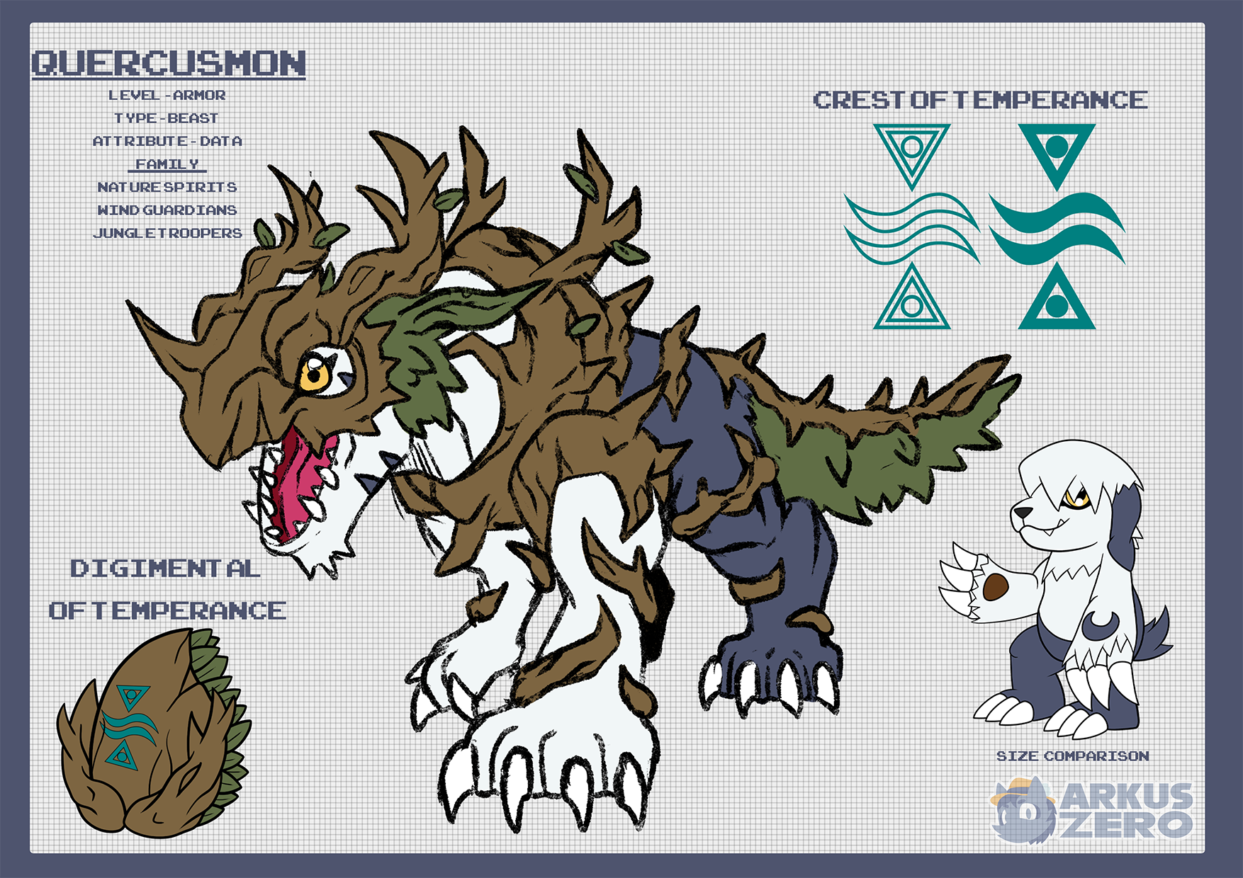 Digimon (C) of Bandai"Keebamon...Armor Digivolve To...QUERCUSMON The Tree Of Temperance!" I like the concept of Armor Digivolution that Adventure 02 introduced. A type of evolution that uses a Power Up to achieve a form stronger than a Rookie but not quite as strong as Champion. Though I have seen different takes on that thought (just as strong as Champion, can be as strong as Ultimate, etc) I just prefer my idea of it. For Keebamon, I was planning to eventually design him an Armor level form or two once I got his mainline evolutions finished. But when I found Quercusmon's design up for adoption by https://x.com/IdleCatGamer I couldn't resist. The original design did need some tweeks in colours to make him fit more as a form for Keebamon but I think it turned out great. The Digimental (Digiegg) and Crest were designed by me. Went for a design that resembled his helmet like some of the official designs, though an alternate idea I toyed with was having branches coiled around into an oval shape. As for the Crest of Temperance, I mulled over what was my best virtue and after looking through a list of options I felt this one suited me best (Temperance = Moderation, Balance, Self-Dicipline), it's a virtue I consider a good fit but also something I still fail to live up to at times. Also helps that while I did find a few Fanmade Crests representing "Balance" none were for "Temperance" so it scratches my Unique itch. As for the Crest's design I took inspiration from a Tarot card representation of the virtue and tried to "Digify" it up a little. While I am pleased and happy how this turned out, I am not entirely sure if it's a Crest I would apply to Keebmon's Ultimate form as my plans go far in the opposite direction of a plant type Digimon. I'm talking Cyborgs and Machines. Quercusmon design and art adopted from https://x.com/IdleCatGamer Keebamon, Digimental and Crest of Temperance (C) of me @Arkus0 Digimon (C) of Bandai0 Comments 0 Shares 39 Views -