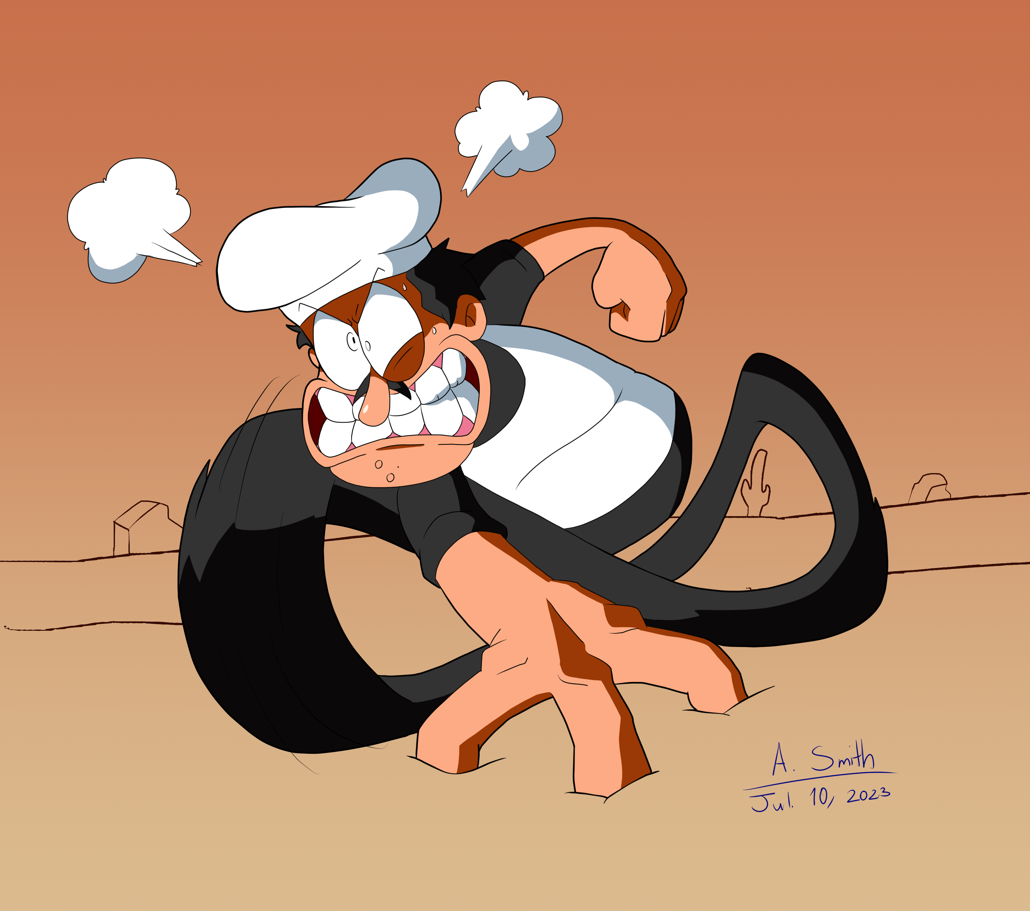 I've been playing _Pizza Tower_ lately, so I wanted to try my hand at drawing Peppino. As you can see, I've based the pic off of that one Archie Sonic panel.