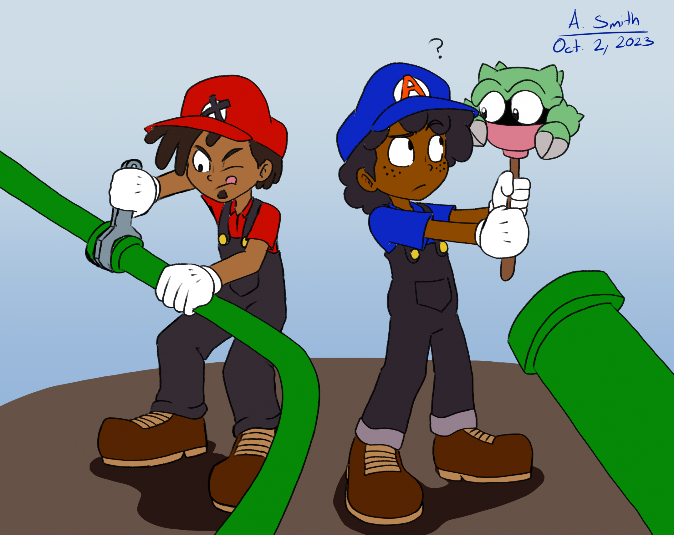 Here we are with a colored sketch of Xavier and Aaron taking up plumbing! Say, this seems familiar...