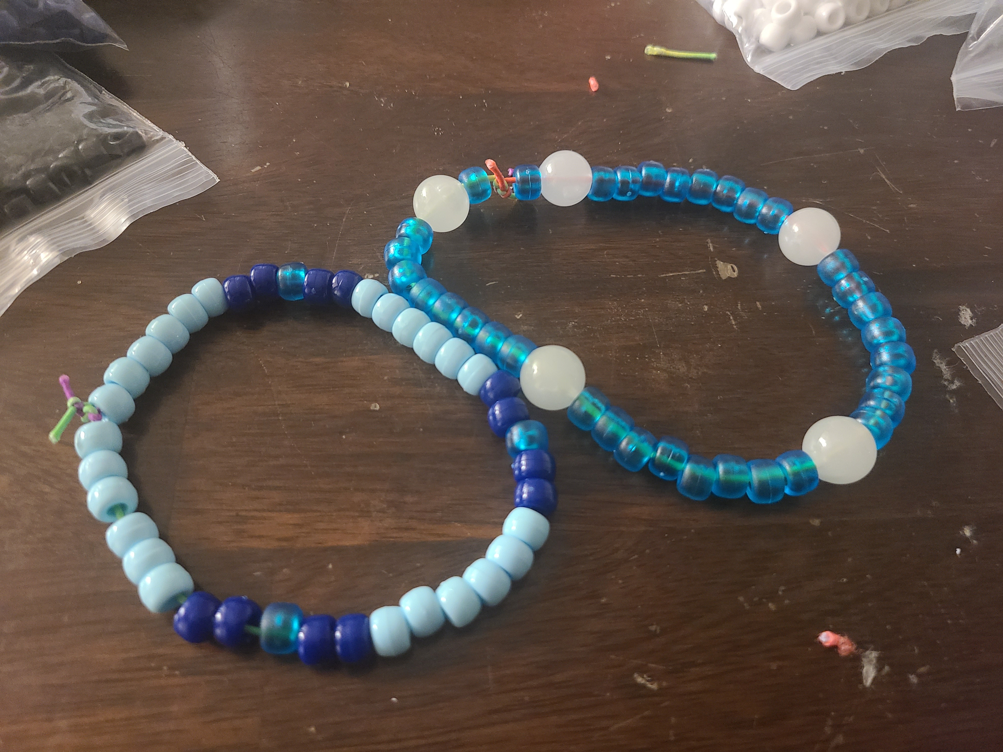 Two pony bead bracelets, one is three different shades of blue, while the other is blue with pale orbsTwo pony bead bracelets, one is three different shades of blue, while the other is blue with pale orbs0 Comments 0 Shares 4 Views