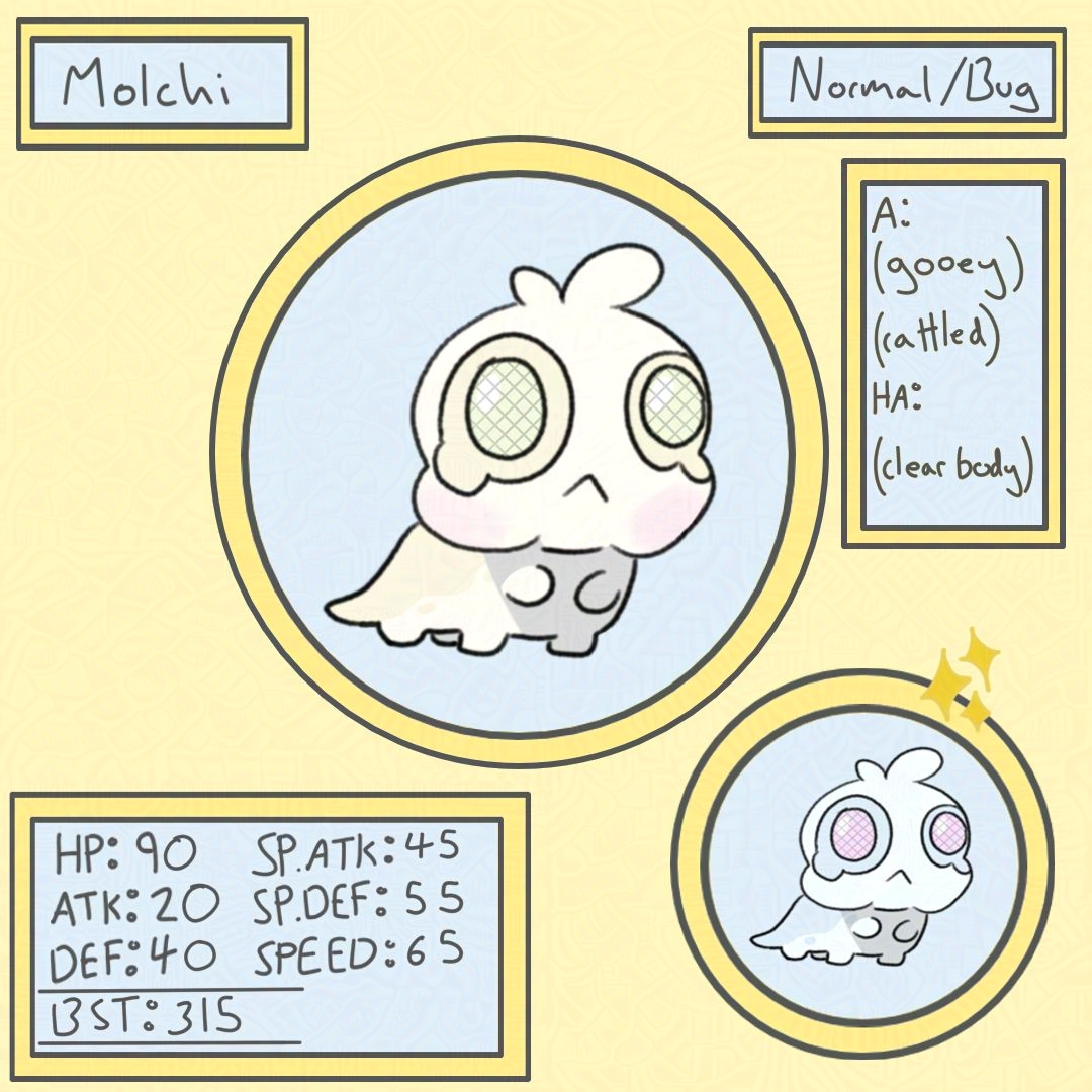 An early route normal & bug type, its squishy body and baby like demeanour make it popular amongst trainers just starting off.Who's that fakemon? It's Molchi! An early route normal & bug type, its squishy body and baby like demeanour make it popular amongst trainers just starting off.0 Comments 0 Shares 6 ViewsPlease log in to like, share and comment! -