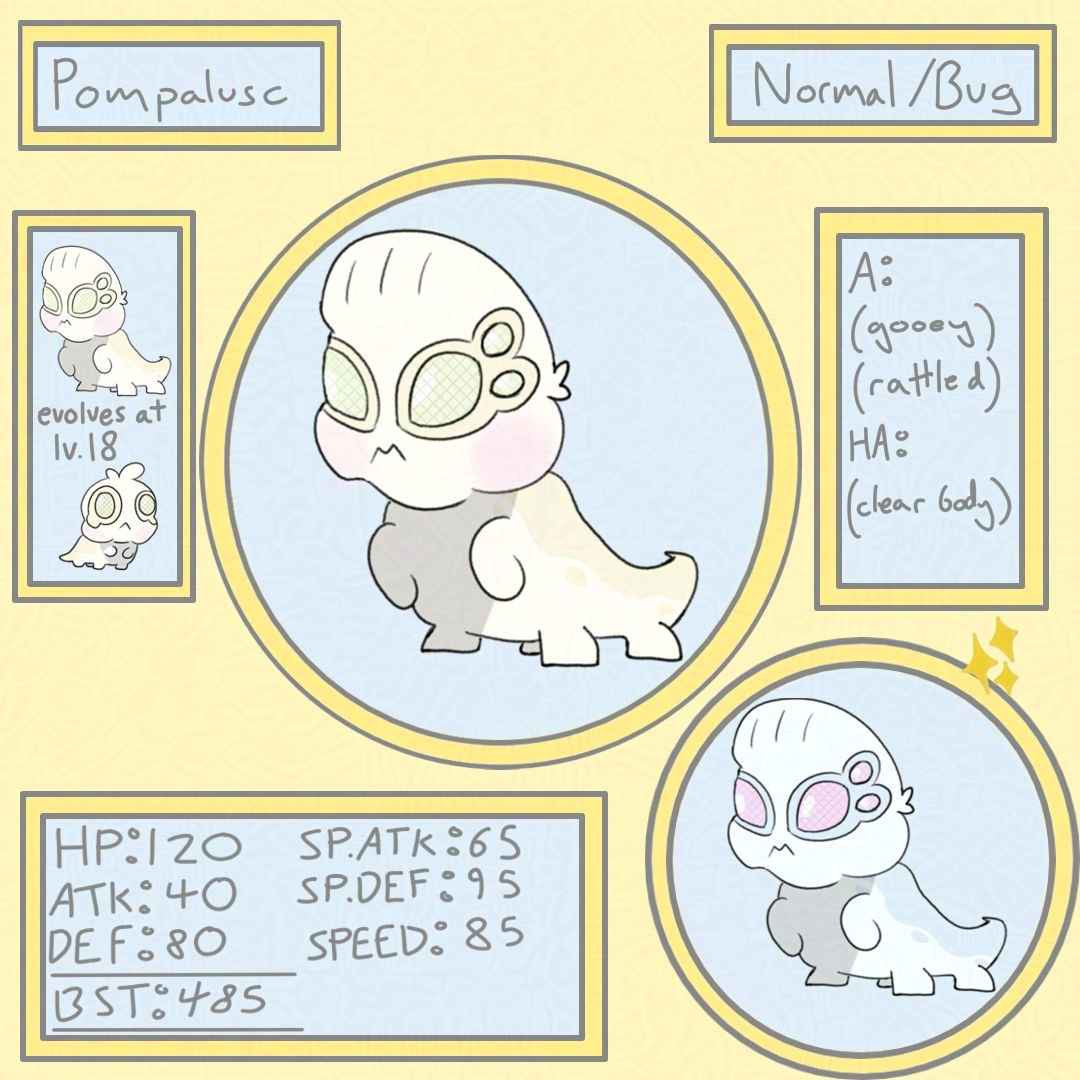 A normal & bug type, it teases and attempts to bully other pokemon in its territory, but this usually ends with Pompalusc being beaten up instead. It's fiercely protective of its friends.
