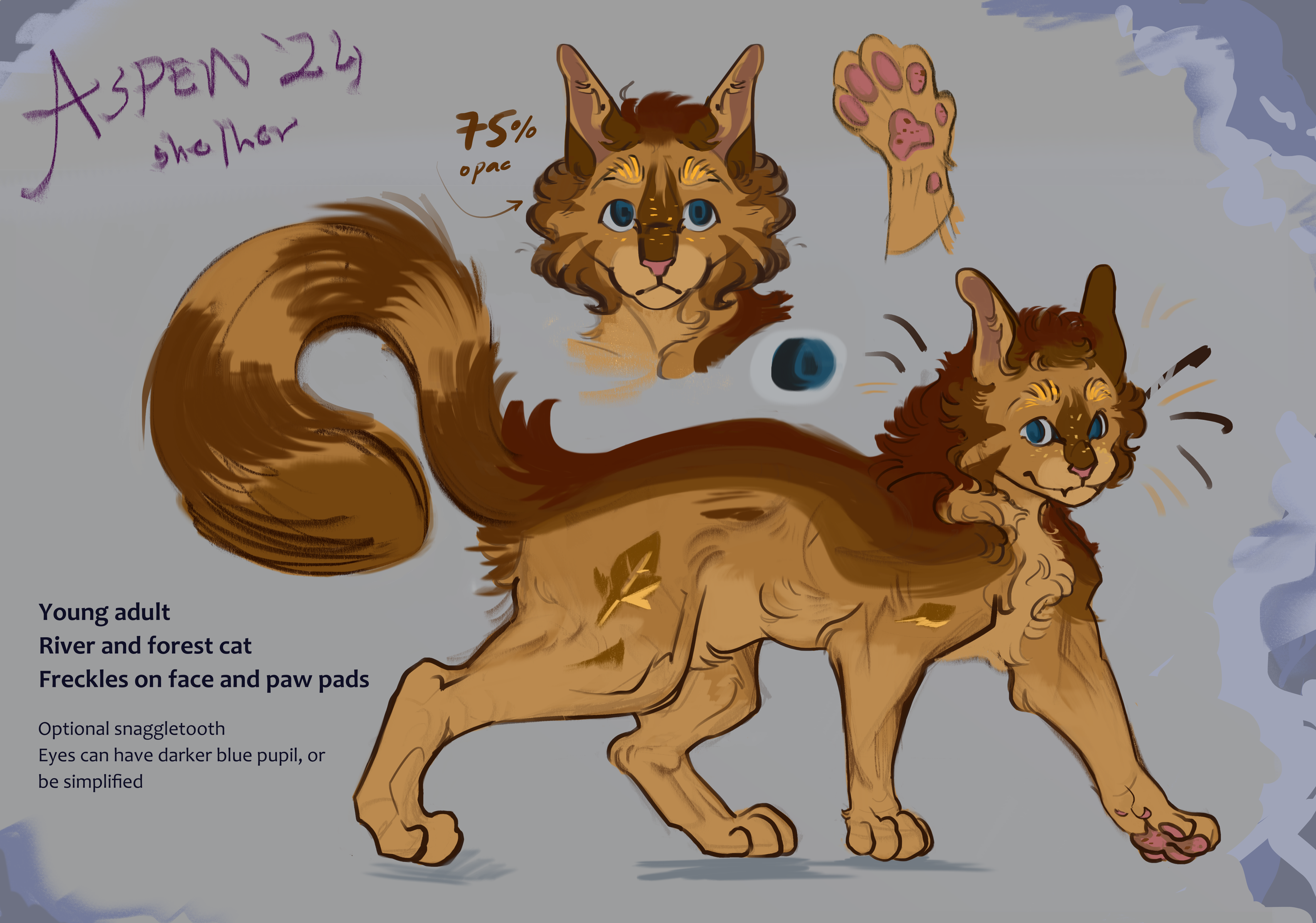 New reference for my sona! Her design is somewhat flexible! (I draw her differently each time anyway based on vibes). This includes her cheek stripes- the lighter colour / lowered opacity is also optional Attack me on artfight > https://artfight.net/~aspenlleaves0 Comments 0 Shares 5 Views -