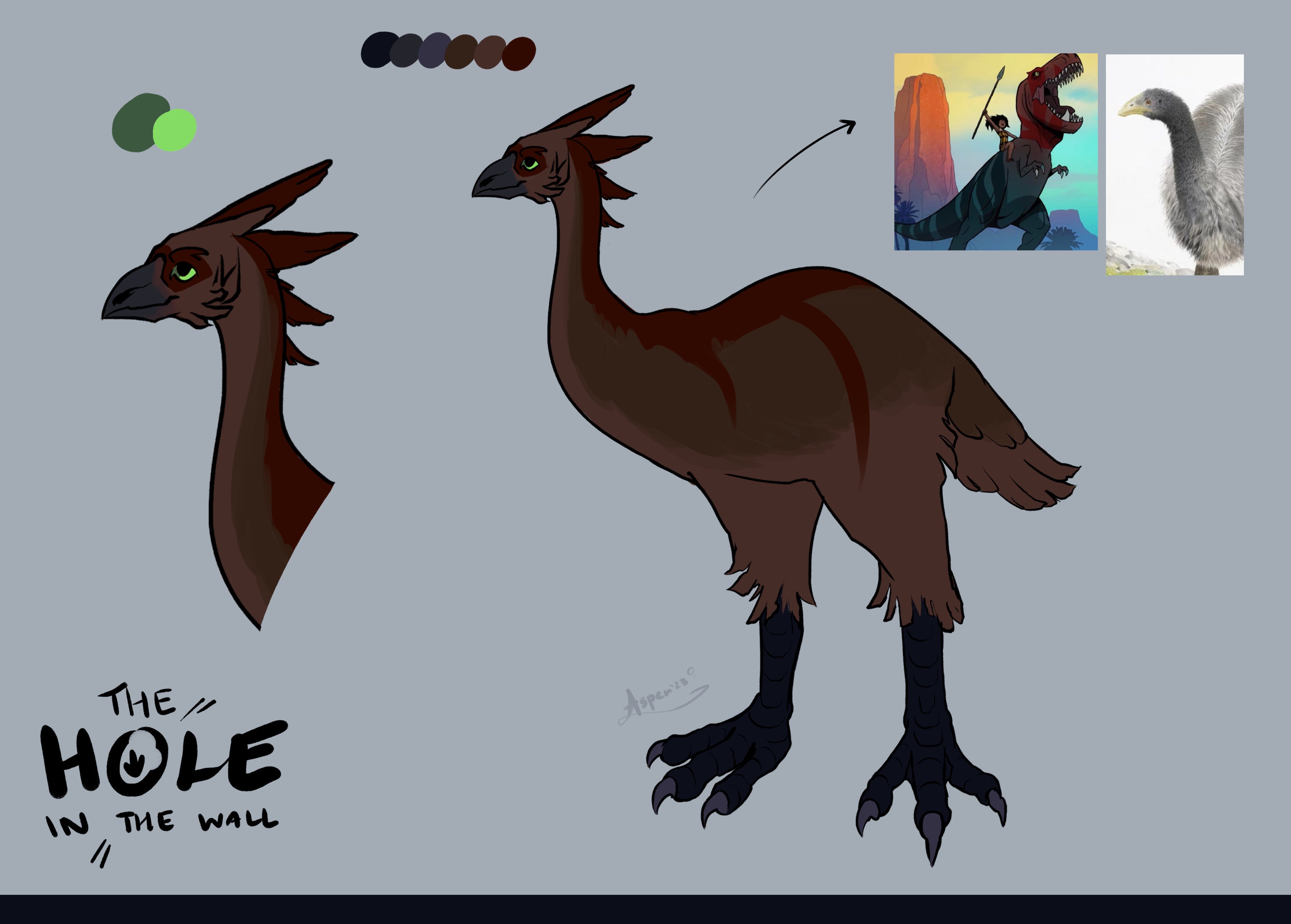 A design for my class group project/story. He's a rather fantastical moa character, with Studio La Cachette as a main influence for our group (reference image shown is from 'Primal').