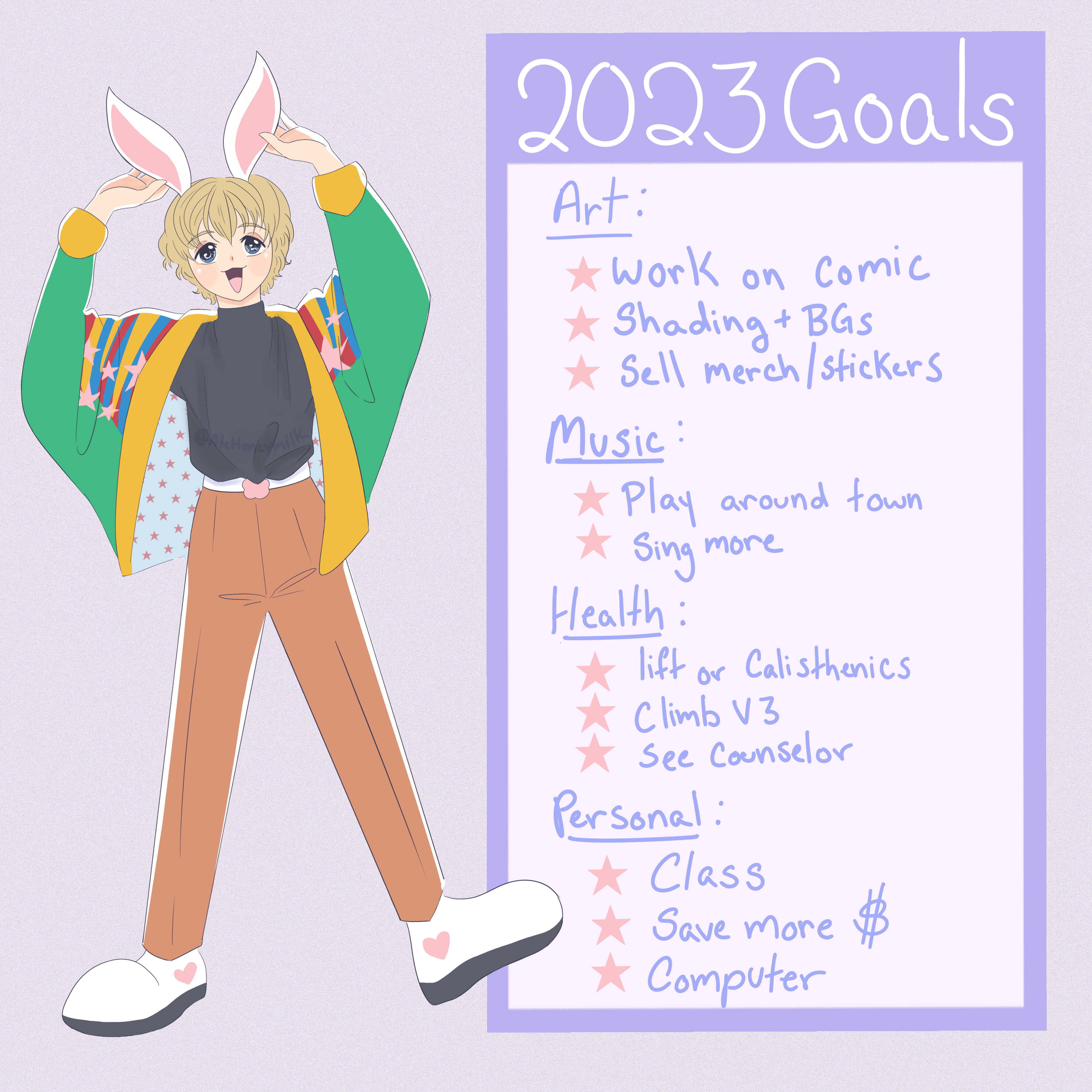 As of now I'm making progress with mostly the Art and Personal goals. Particularly with Art I've been working on some comics, adding more backgrounds to things, and making my own stickers! My art has come a long way since I picked up digital art, and I'm excited to keep going!It's March but I figured I should post this sooner rather than later! I did originally post this on January so it's not like I'm that late lolol. This is the second year I've made goals like this for myself. Last year I set some high goals to try to push myself. I didn't get to a lot of goals so I've tried to reign it back more this year. It's still out of my comfort zone a bit but also achievable! As of now I'm making progress with mostly the Art and Personal goals. Particularly with Art I've been working on some comics, adding more backgrounds to things, and making my own stickers! My art has come a long way since I picked up digital art, and I'm excited to keep going!0 Comments 0 Shares 41 Views -