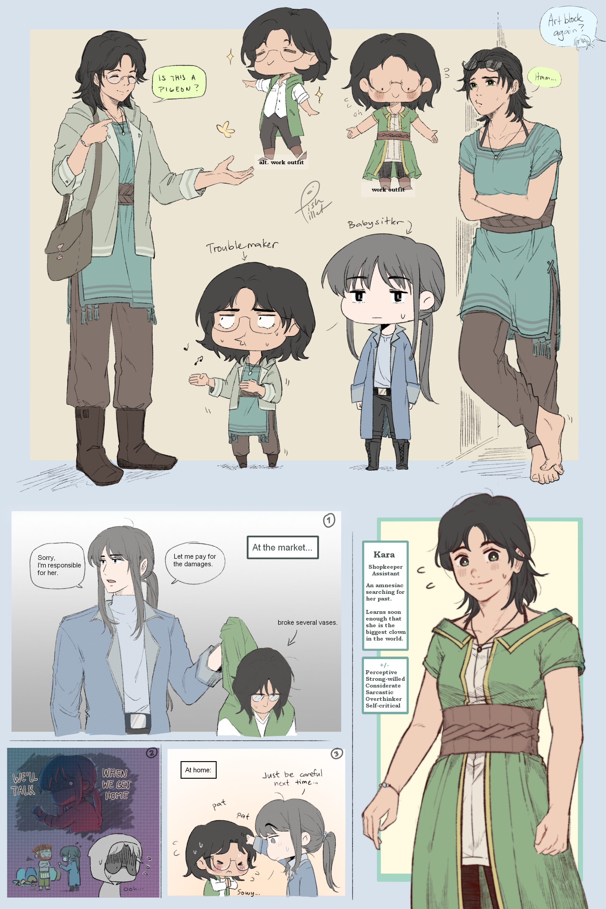 Also might as well practice my english by trying to write very, very, ***very*** short... stuff. Whahahaha"Hello! I would like to purchase this wonderful fruit you have for sale! How much do you charge for a piece?" Raden points at a particular shiny one that caught his eyes. He gives his most polite smile to the shopkeeper, as a guest, he doesn't really want to leave a bad impression in human territory. Ralf, on the otherhand, just snorts at him as he takes the shiny one from the pile in front of them, "...Buddy, you can just ask, 'How much for this fruit?'" "Oh... " The shopkeeper shakes her head, " At least your friend looks a lot less of a troublemaker than you are, Ralf-ling." "Ack..." She gives the kids another fruit, "Just 1 copper. And _this_ one's on the house. Now go on, shoo. Show your friend around the village." The kids thank the older woman, and with each holding a snack to munch on, the wolf-kid follows the fox-halfling as he shows him around his home. > ------ _An old 2021 work of mine. This was supposed to be a part of a bigger picture since I was planning to draw an actual marketplace but I got lazy LOL_ Also might as well practice my english by trying to write very, very, ***very*** short... stuff. Whahahaha0 Comments 0 Shares 3 Views -
