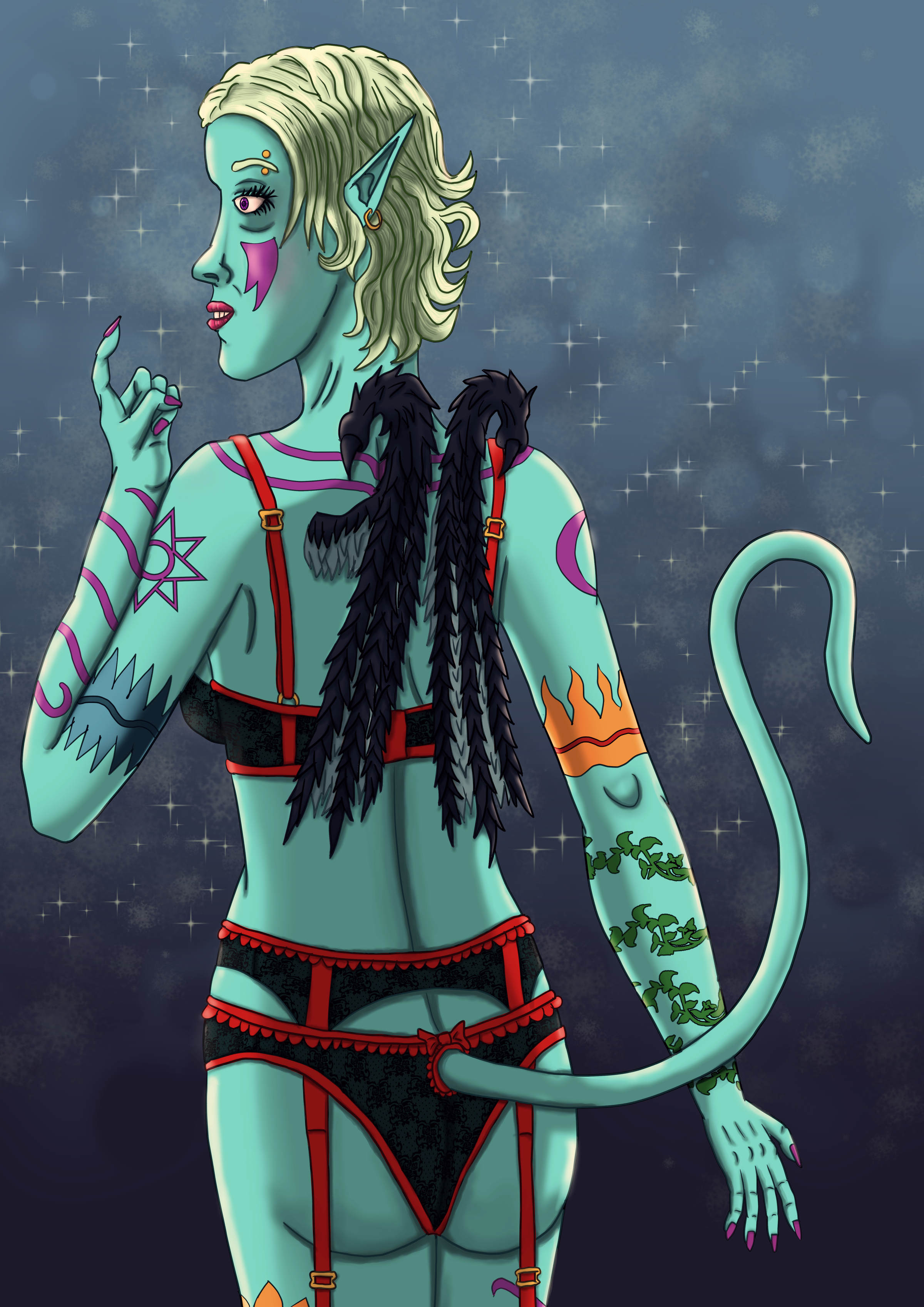 Based on my previous sketch, this time experimenting more with materials.Frelly is showing off her lingerie, and that most of her panties have a hole in the back for her tail. As I often do consider how she accommodates having wings and a tail with her clothing. Based on my previous sketch, this time experimenting more with materials.0 Comments 0 Shares 24 Views