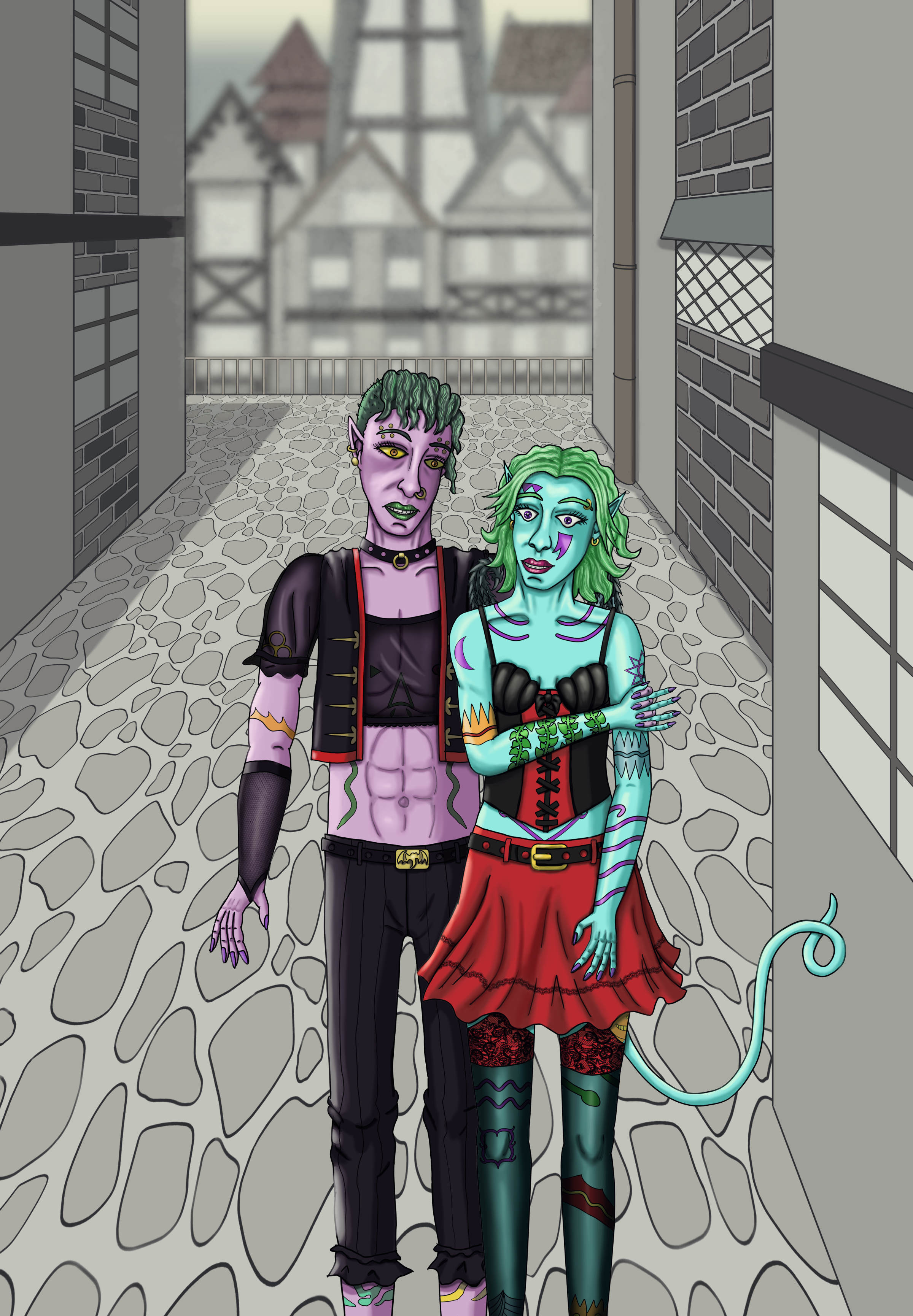 The OCs in this as D&D characters are: Kess, a Chaotic Neutral Githzerai Psion (Shaper) / Fighter (Psi Warrior) who stands at 190cm (6’3). Grika, a Chaotic Good Goblin Artificer (Artillerist) who stands at 122cm (4’0). And Frelly a Neutral Good Chthonic Tiefling Bard (College of Glamour) who’s around 154cm (5’1).