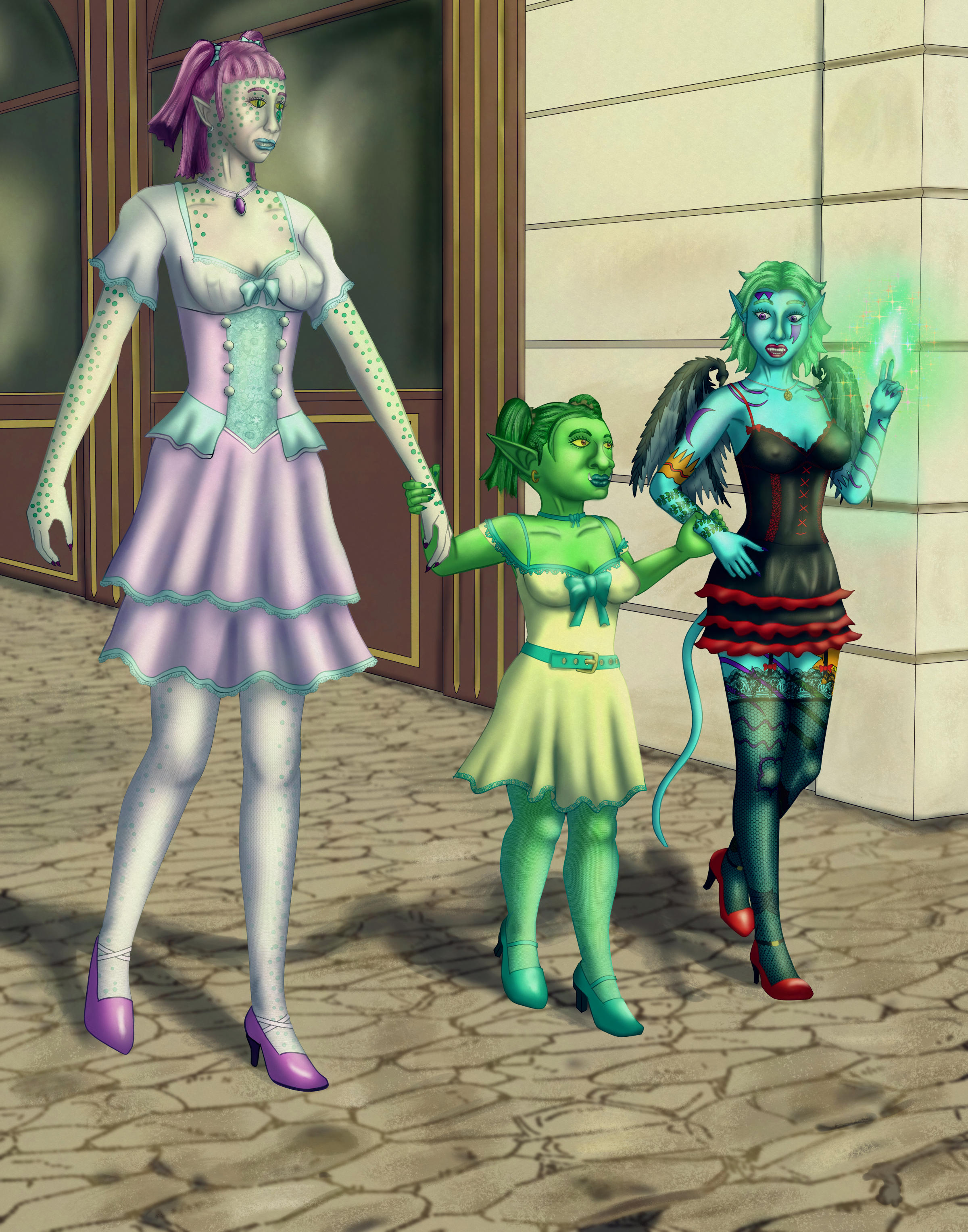 “Sure, it all goes back to me using special skills to get me way,” Frelly replied. “I’m not going to be retiring from me job as a professional-tart soon enough.”This is of 3 of my OCs from left to right Kess, Grika and Frelly, I was experimenting more with 3d figures in Clip Studio Paint. With 3 different models, it actually made me think more about their heights in comparison. For Grika, as a Goblin, I ended up making her head, hands and feet proportional big for her size. The OCs in this as D&D characters are: Kess, a Chaotic Neutral Githzerai Psion (Shaper) / Fighter (Psi Warrior) who stands at 190cm (6’3). Grika, a Chaotic Good Goblin Artificer (Artillerist) who stands at 122cm (4’0). And Frelly a Neutral Good Chthonic Tiefling Bard (College of Glamour) who’s around 154cm (5’1). *** Kess, Grika and Frelly were walking down to the market, Grika holding on to Kess’ and Frelly hands so that she could keep pace with the other two girls. “They have a competition of magical talents!” Grika told the other two. “I know those aren’t about true magical skills.” Frelly looked down to Grika. “They’re always just about the performance you give off.” “Well that’s something you’d be wonderful at! Me throwing around crystals and goop might not make too many mates.” Kess responded. “Me too, I didn’t bring anything from the workshop!” Grika looked back at Frelly. “And what good is an exploding walking clock going to do in this?” “Fine you two. Look at this.” Frelly conjured a magical aquamarine coloured flame in her right hand, pointing up with two fingers the flame emitted rainbow sparkles. “I’m sure the wee ones will like this trick.” “This adult one ‘wee one’ is impressed, have you tried that one around my daughter?” Grika asked. “Never,” Frelly replied, “But I’m sure Falla would be thrilled if I did this one. Now, I’m sure if I get tired of the whoring around, I can become a magical clown at all the wee one’s parties.” “You’re taking away my idea!” Kess explained, “That’s my backup plan if, being a wonderful adventuring seamstress self-help guru doesn’t pan out! I’d be some magical clown at all the kids' parties! That or marrying as many rich arseholes as I can!” “That one’s my backup plan, Kess!” Frelly snapped back. “These contests have judges,” Grika interjected. “You just need to convince them of your special talents with your own special way of convincing folks” “Sure, it all goes back to me using special skills to get me way,” Frelly replied. “I’m not going to be retiring from me job as a professional-tart soon enough.”0 Comments 0 Shares 31 Views -