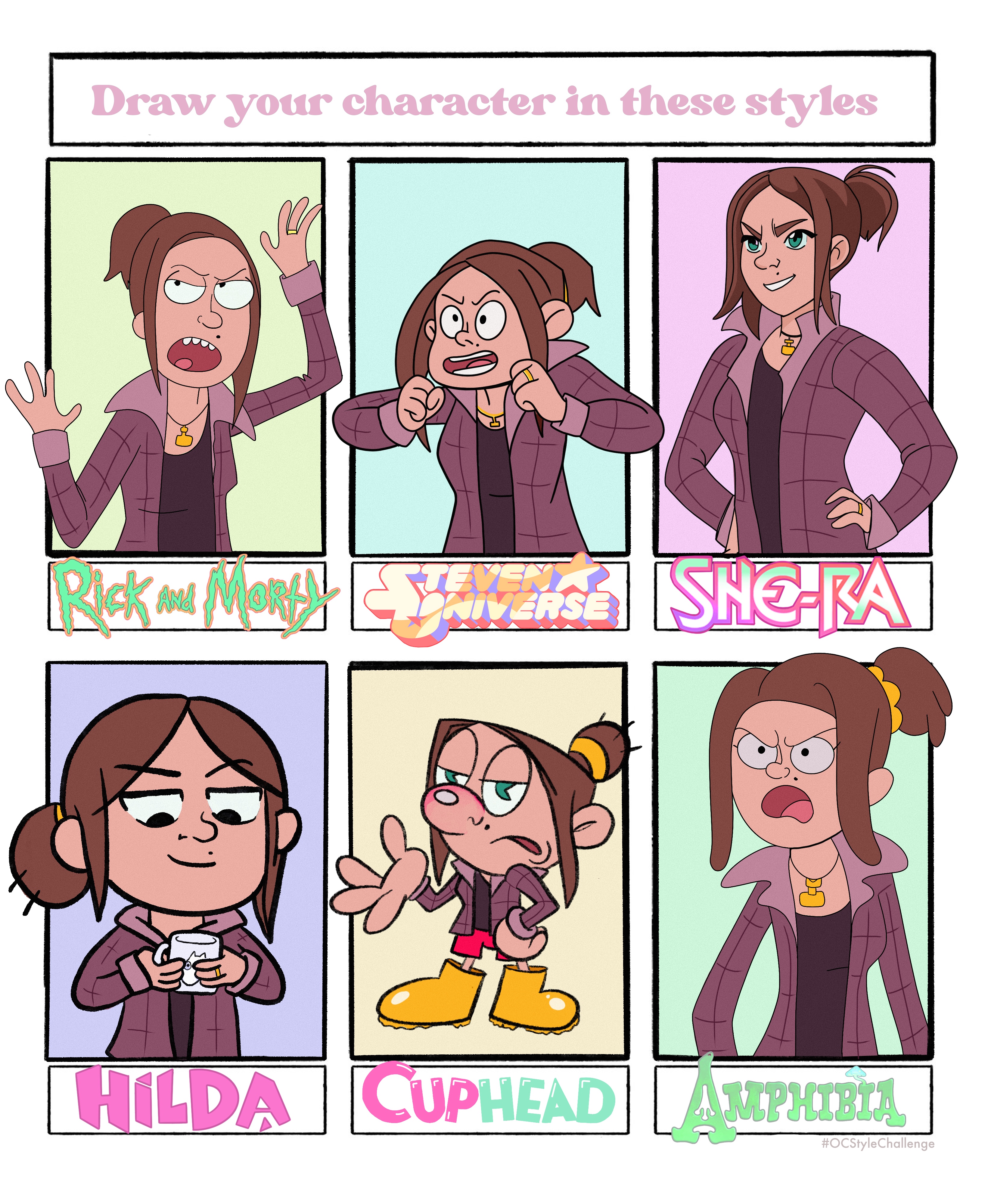 I'm gonna upload this one to ArtFight, to try and attract more artists who won't draw animals, because I definitely wanna draw some humans or anthros this year. My portfolio is very quadruped right now haha. This is just myself, done in a number of current animation styles. There are more out there, but I tried to use as much variety as possible.