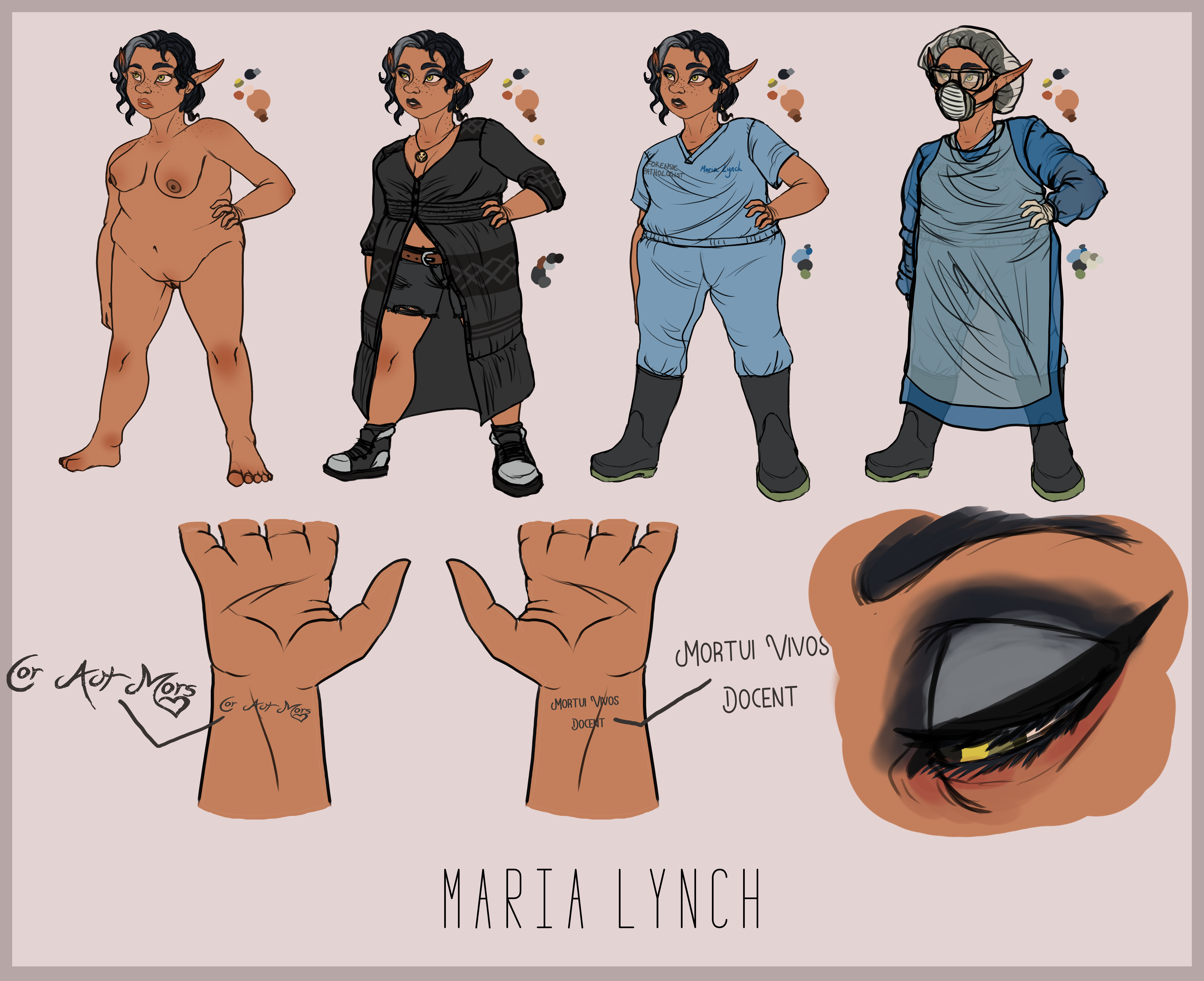 Also she's gay.My new soon-to-be-played D&D character, Maria Lynch! Maria is a Sun Elf cleric, currently working as a Forensic Pathologist in the city of Los Diablos. She is secretly an activist for the Undead and other Creatures of The Night, and often helps Ghouls, Vampires, etc to feed using her "resources" from her job. Maria is caught between a rock and a hard place, as she has to keep her 'charity' secret from not only her boss and colleagues, but also the god she serves as a cleric. Also she's gay.0 Comments 0 Shares 7 Views