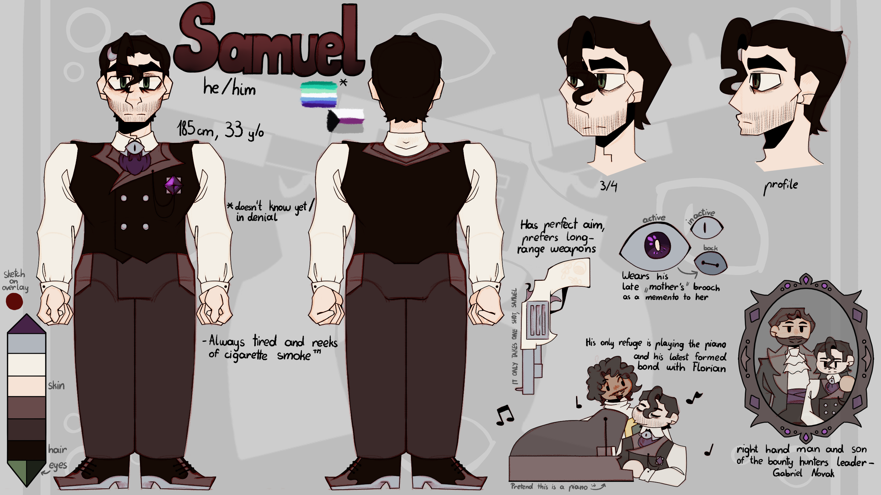 Also, I added Laura's info on UnVale, if anyone is curious.It's technically Samuel Volkov Novak, but that other last name comes into play a bit later. All in all, I think I like this one, even though Sam slightly looks as if someone pissed him off and he is going to snitch on them. Also, Gabriel looks a bit too vampire-like in that doodle, it's the cravat, I think. Link to my ArtFight: https://artfight.net/~blue_sun08 Link to any additional info you might be interested in: https://unvale.io/bluesun08 Also, I added Laura's info on UnVale, if anyone is curious.0 Comments 0 Shares 12 Views -