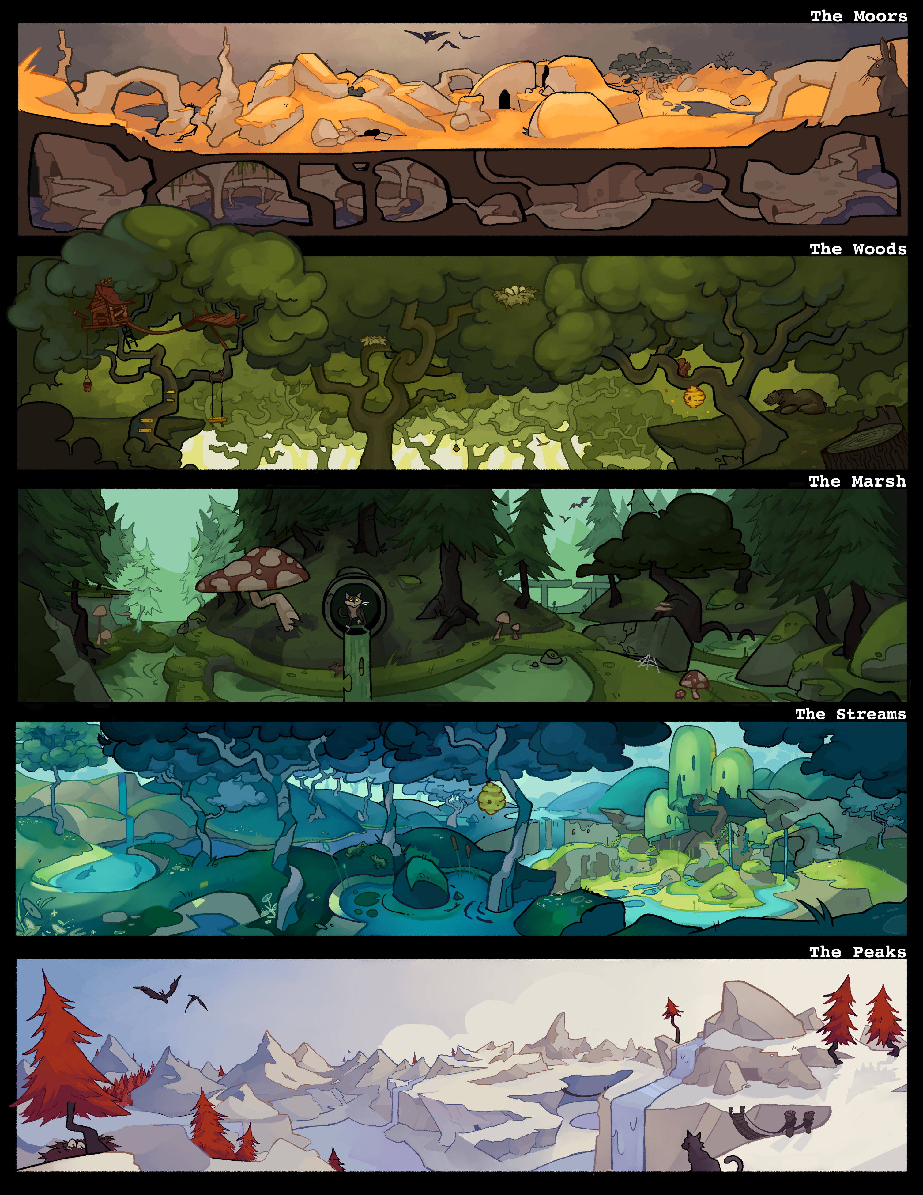 Features: Large and barren. Hostile cold so players seek cover. Rope-bridges over chasms."Environmental piece I'm submitting for my portfolio, trying really hard to pass it off as "Definitely Not the Warrior Cat Forest Territories". Using it as a diagram to explain how I think about movement abilities and map design! Captioned something like this: "With this piece I wanted to communicate how each territory feels to the players, as well as their unique features. Each one is built to encourage non-standard ways of getting around. **The Moors:** Ability: Speed, dark-vision Features: tunnel system, players prone to hawks and rain while above ground. **The Woods:** Ability: Climbing Features: Prey and landmarks in treetops. Dangers on the ground. **The Marsh:** Ability: Darkvision, Poison resistance Features: Infested Sewer system, dubious mushrooms **The Streams:** Ability: Swimming, fishing Features: Highway-like river system, fishing ponds **The Peaks:** Ability: Players Can claim spots and customize their own dwellings Features: Large and barren. Hostile cold so players seek cover. Rope-bridges over chasms."0 Comments 0 Shares 25 Views -
