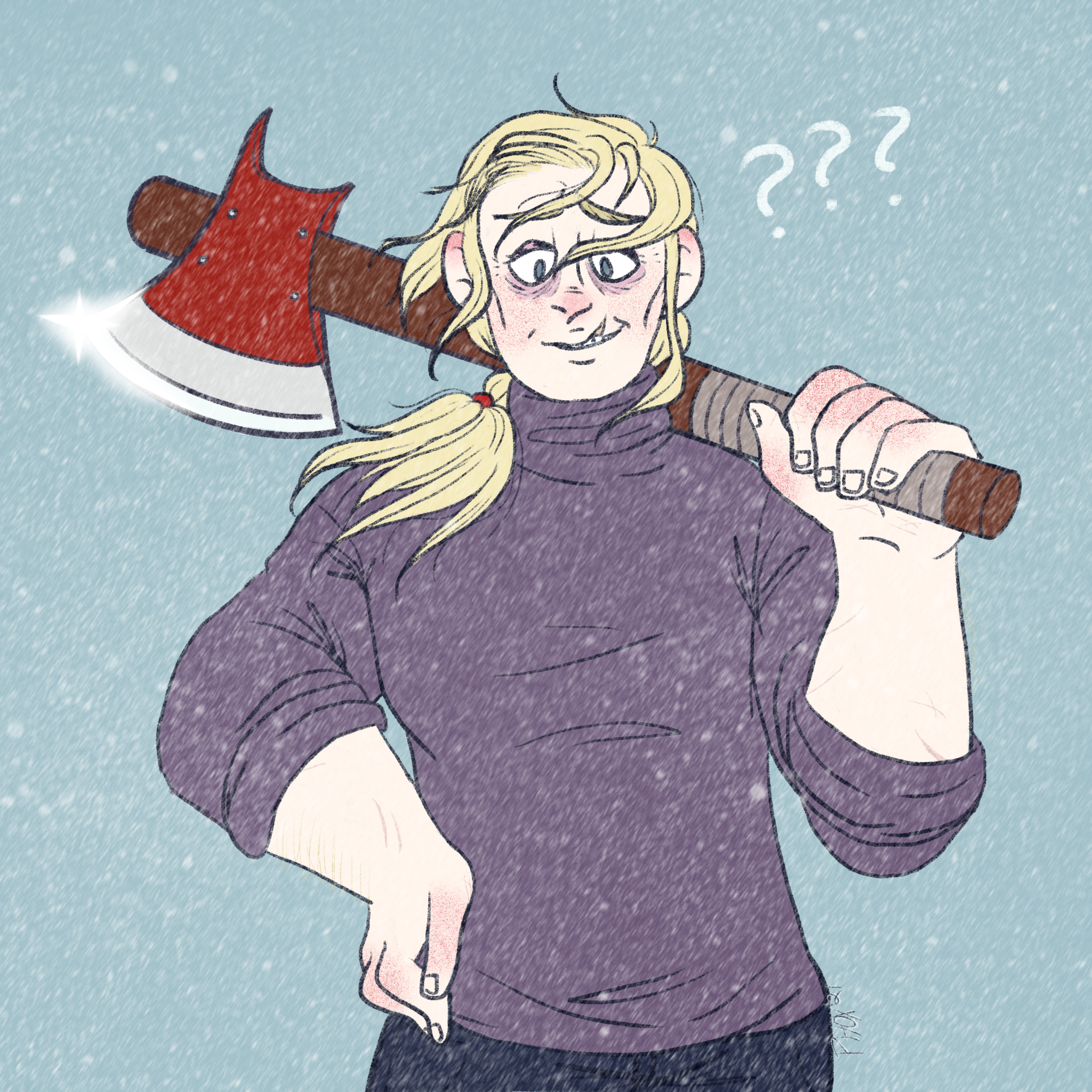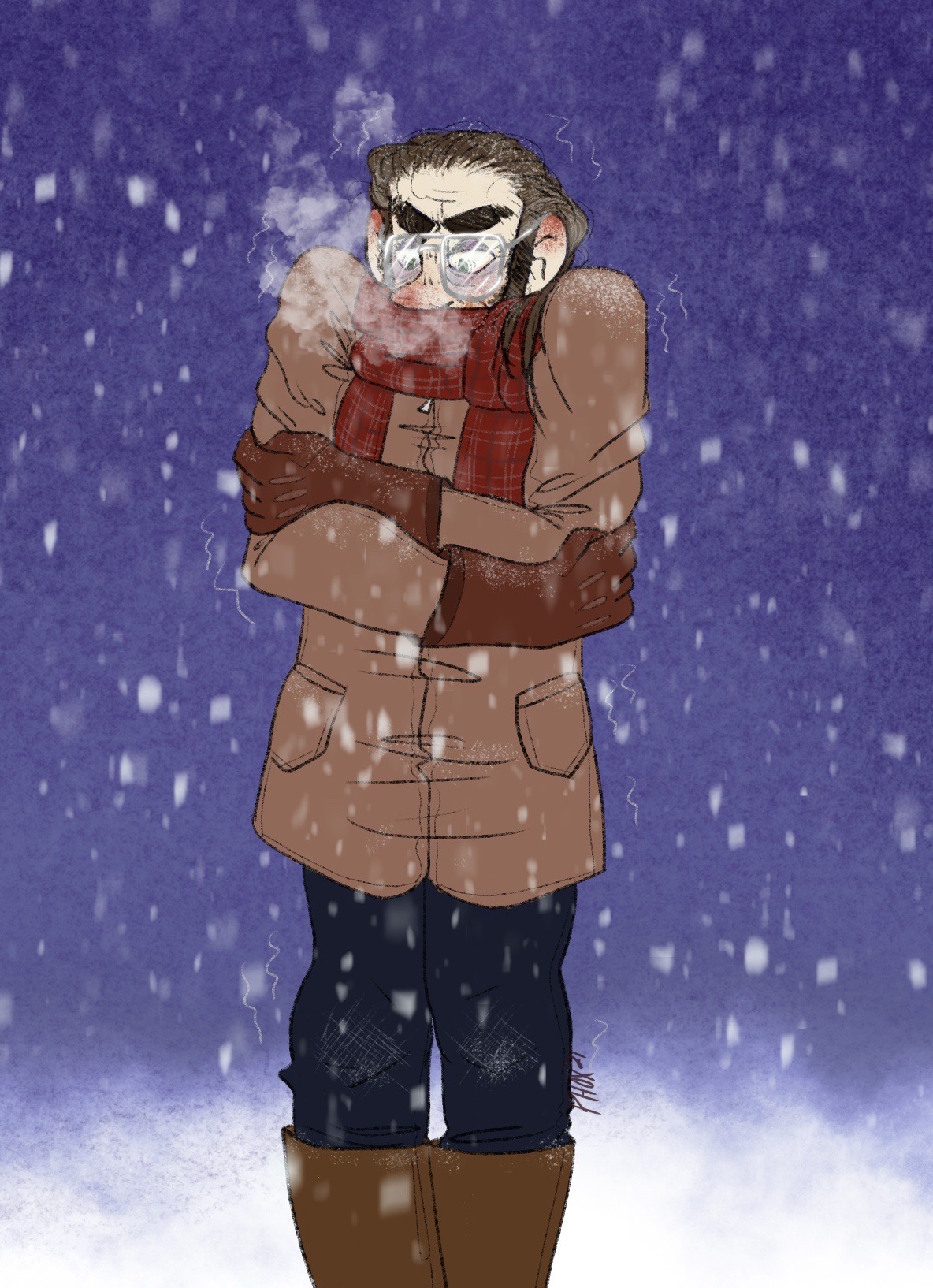 my oc Cooper Murphy, he may be from West Virginia but he isn't used to nearly sub-0 levels of cold. which is unfortunately the constant weather of his wife's (Lorie!) hometown