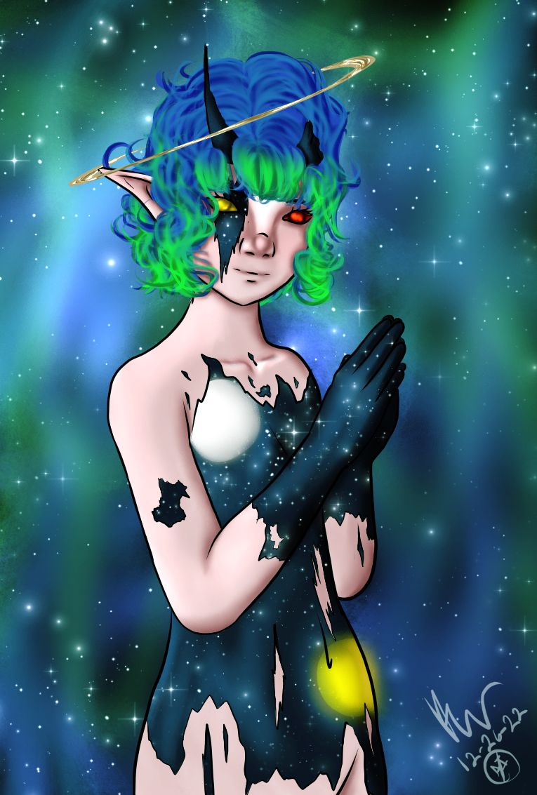 I came across a TikTok to make a space oc and I thought it would be fun. This is Nova she is a space deity that resides in the Astral plane.