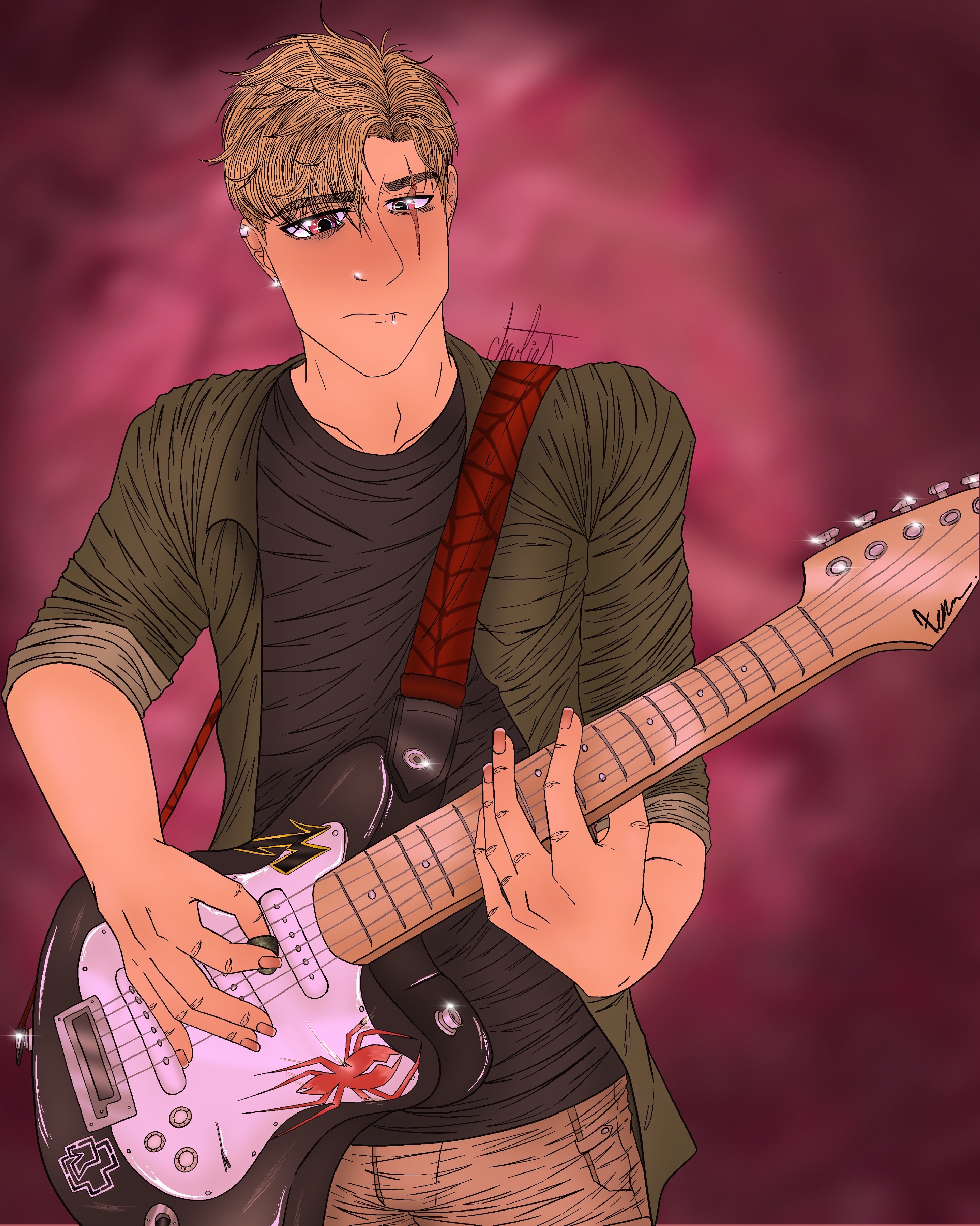 That’s all for now!Just a little piece I finished of my OC, Jacob today. He’s a hobby guitarist, and he’s bleedin good at it too! Though he doesn’t like to show off, his best friend usually strong arms him into showing his skills, be it through just backing them up on their open-mic performances…or mocking him until he begrudgingly goes to perform what he likes to play. That’s all for now!0 Comments 0 Shares 9 Views